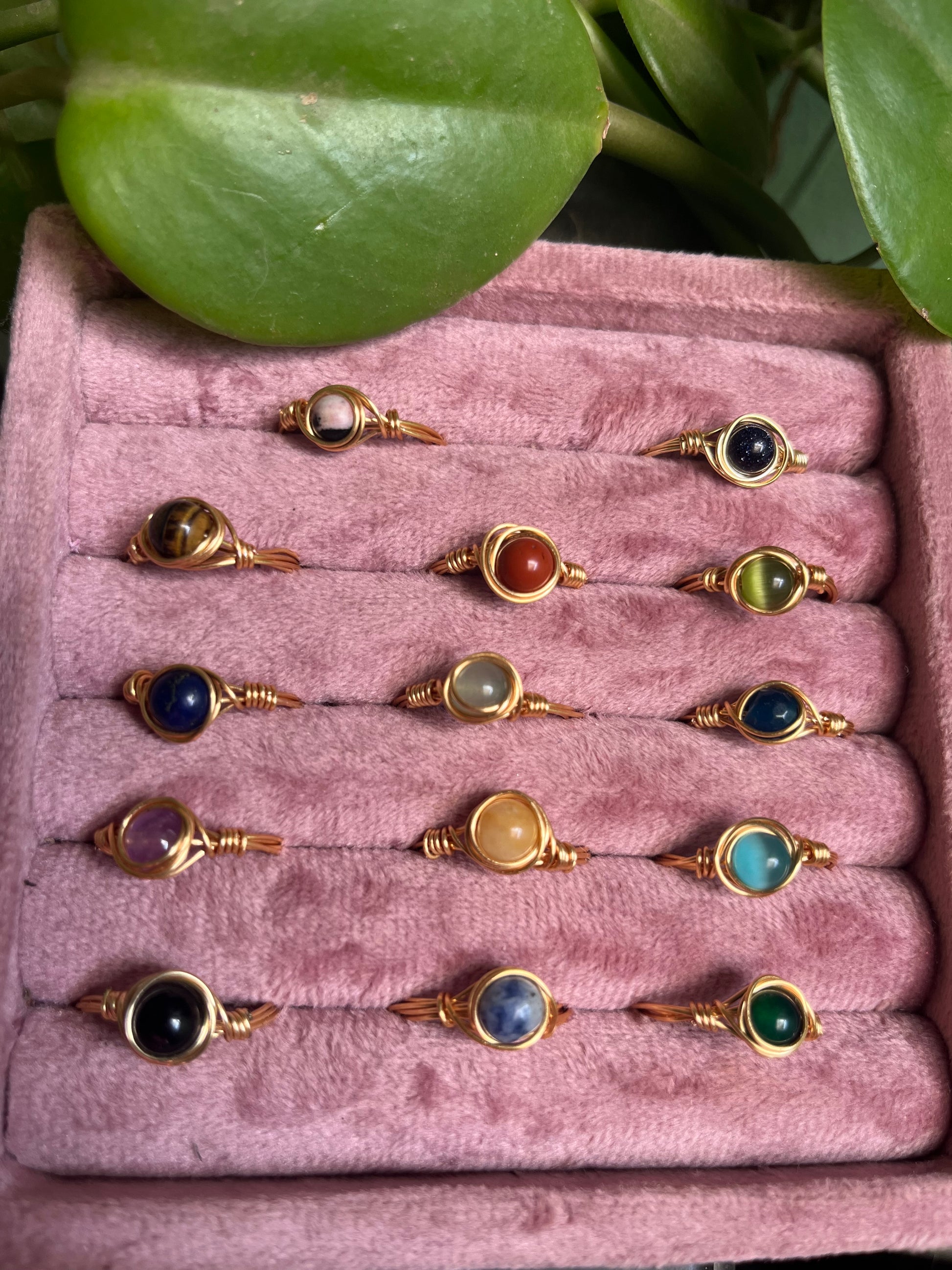 Anillo con cuenta de esfera de cuarzo a elegir, ensamblado a mano con alambre chapado en oro de 18k.