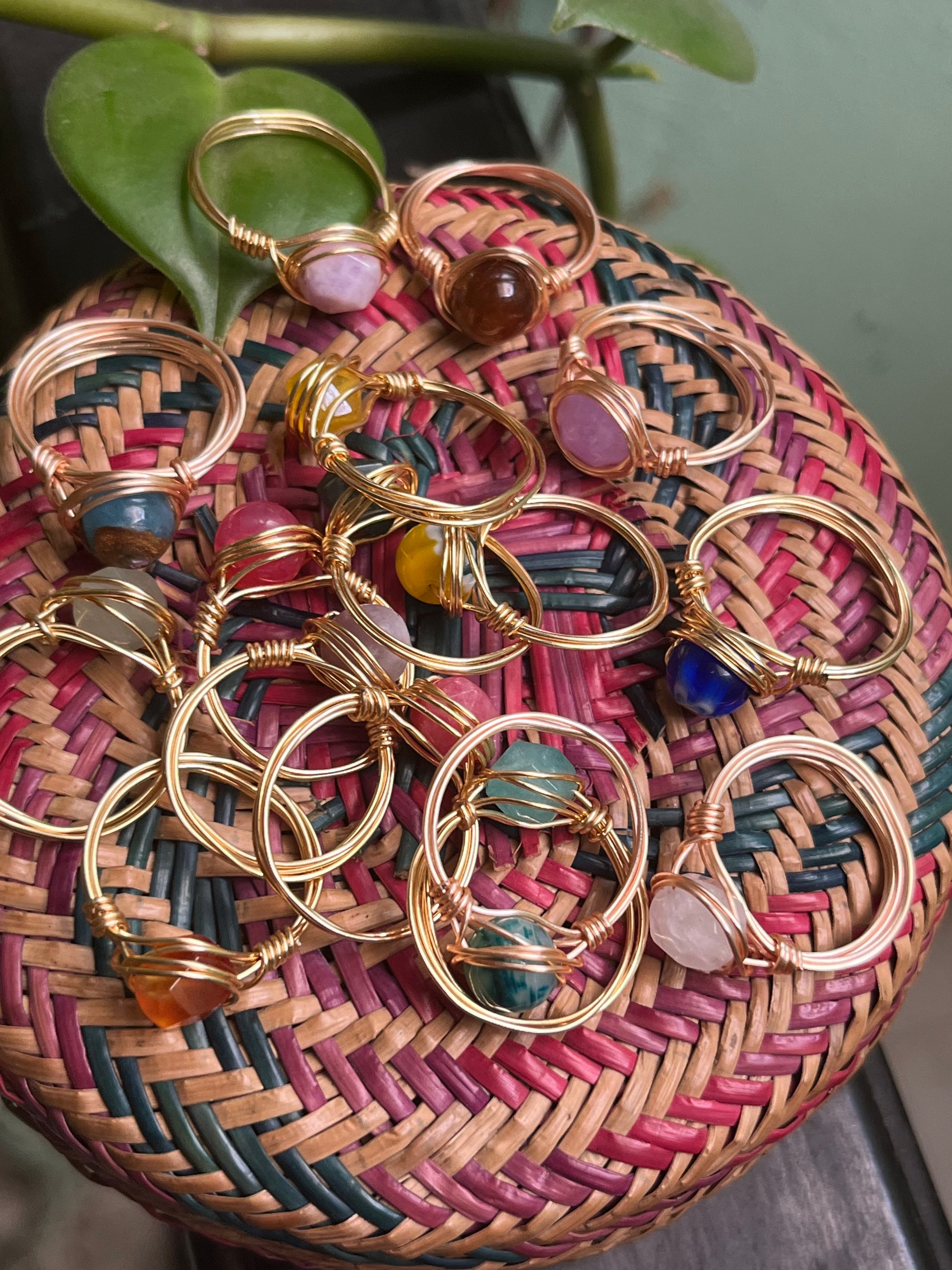 Anillo con cuarzo facetado y ensamblado artesanalmente con alambre chapado en oro.