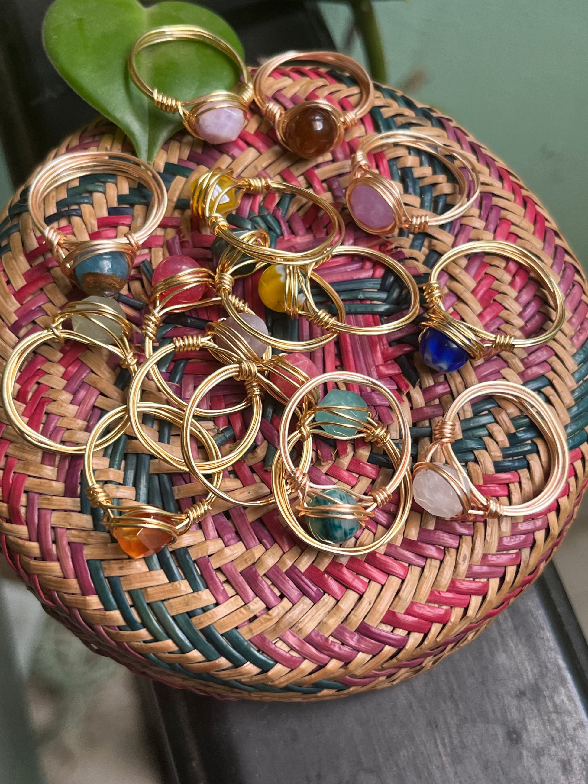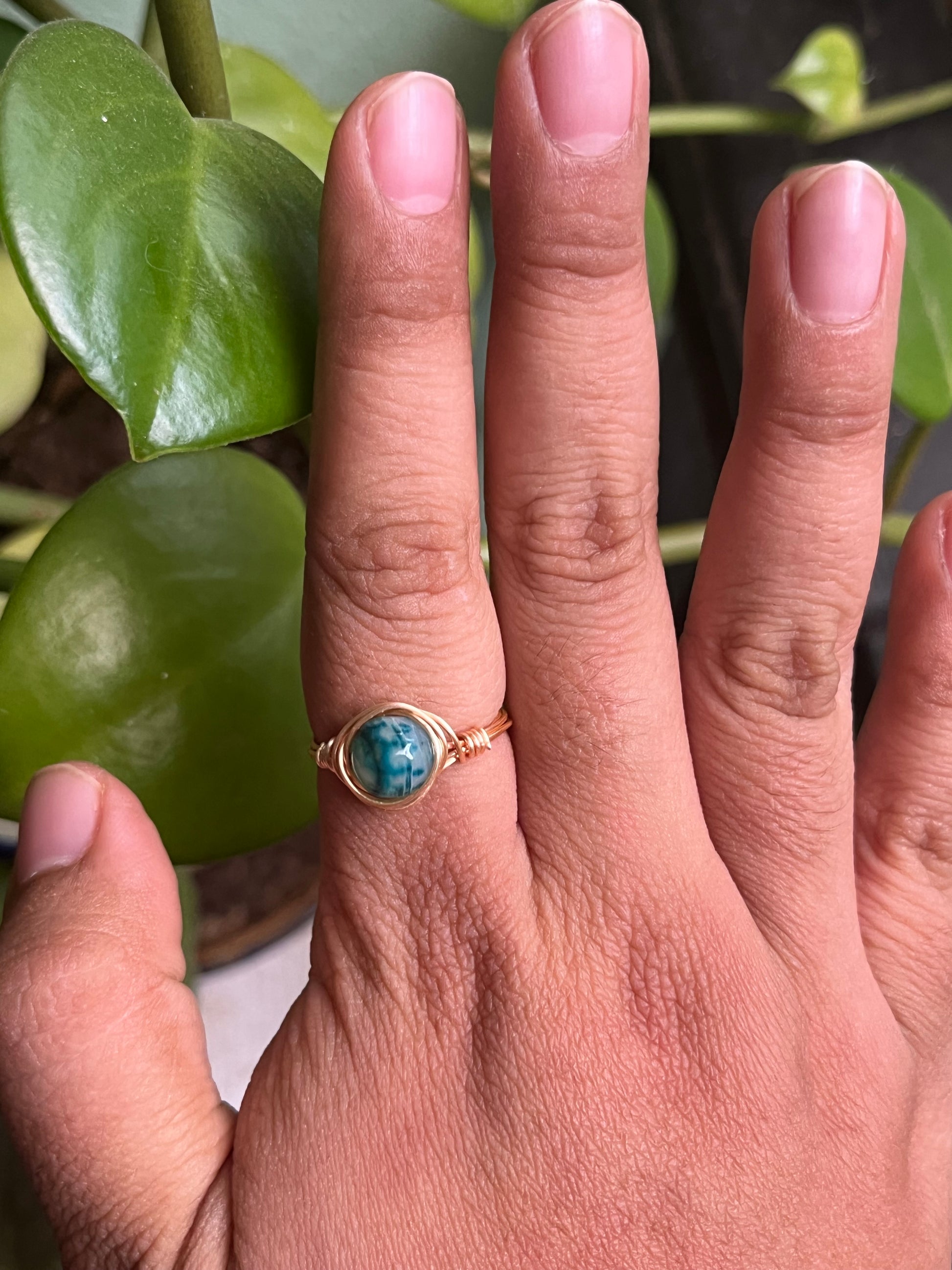 Anillo con cuenta redonda 8mm hecho de manera artesanal con alambre chapado en oro.