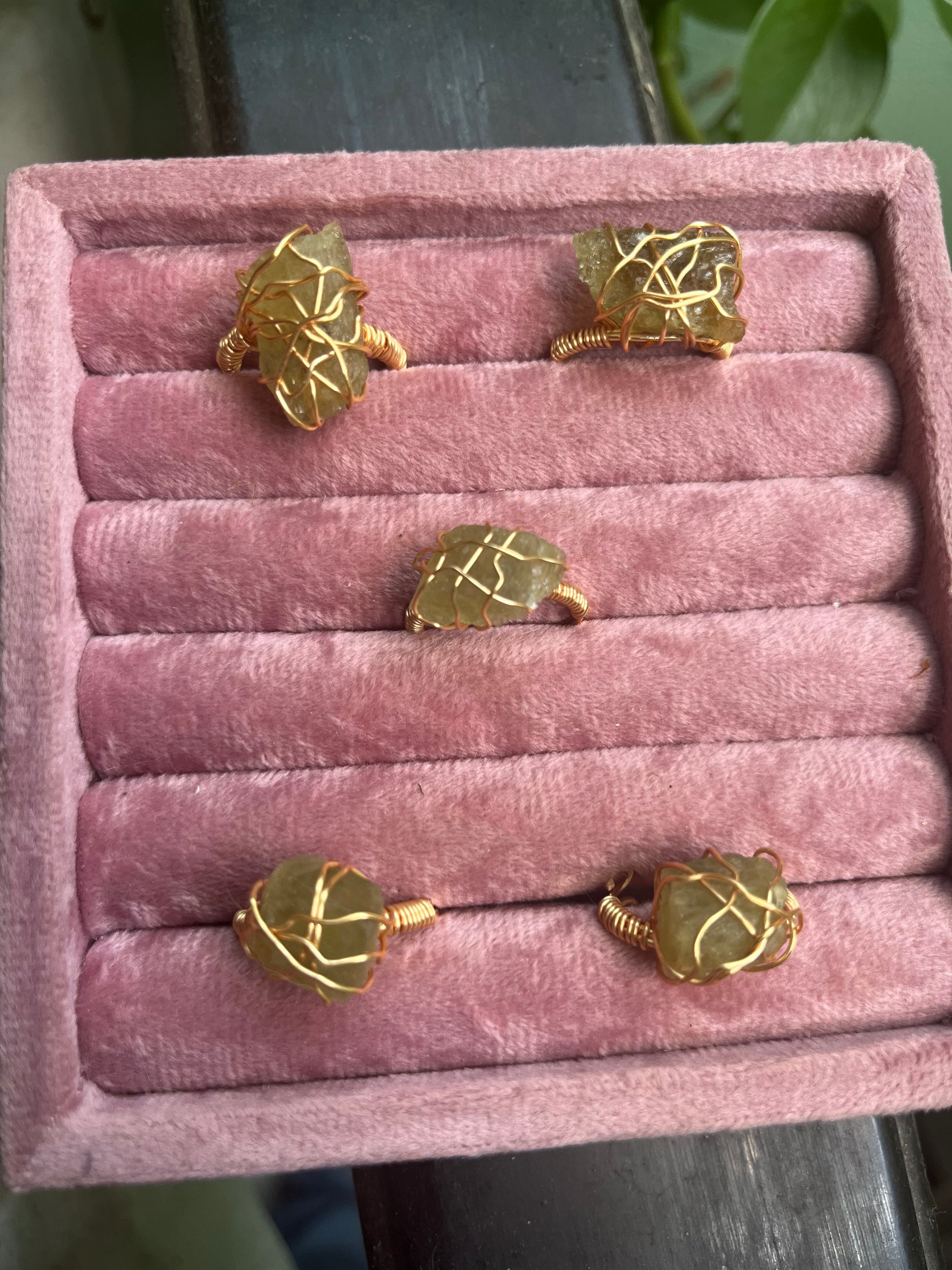 Anillo ensamblado de manera artesanal con alambre chapado en oro de 18k y peridoto en bruto