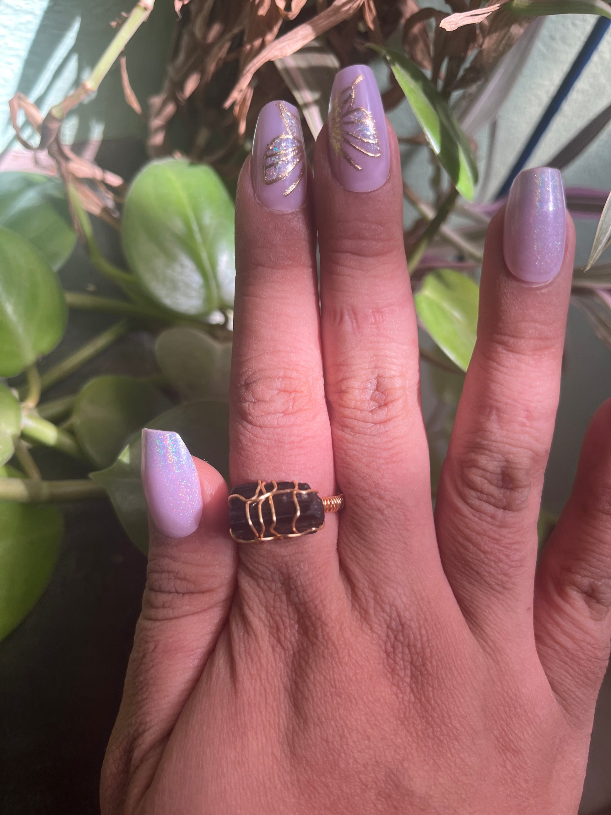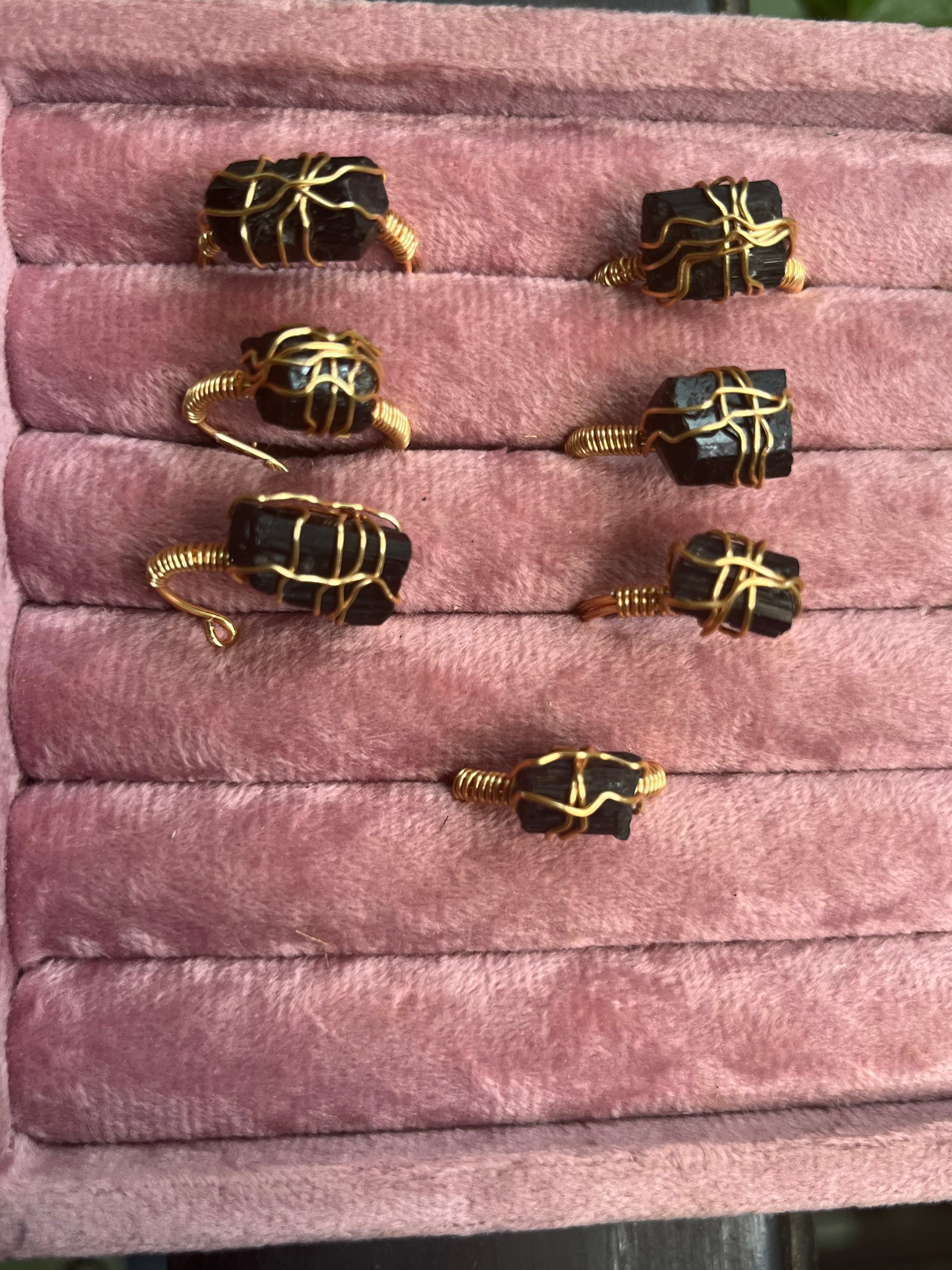 Anillo ajustable ensamblado de manera artesanal con alambre chapado en oro de 18k y turmalina negra en bruto.