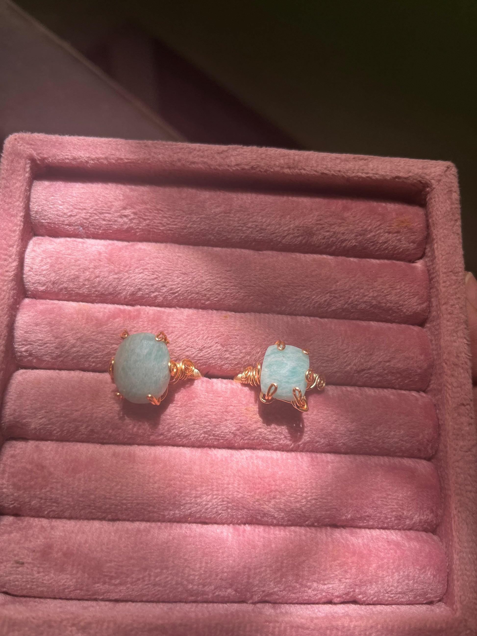 Anillo ajustable ensamblado a mano con alambre chapado en oro de 18k y dije de amazonita.