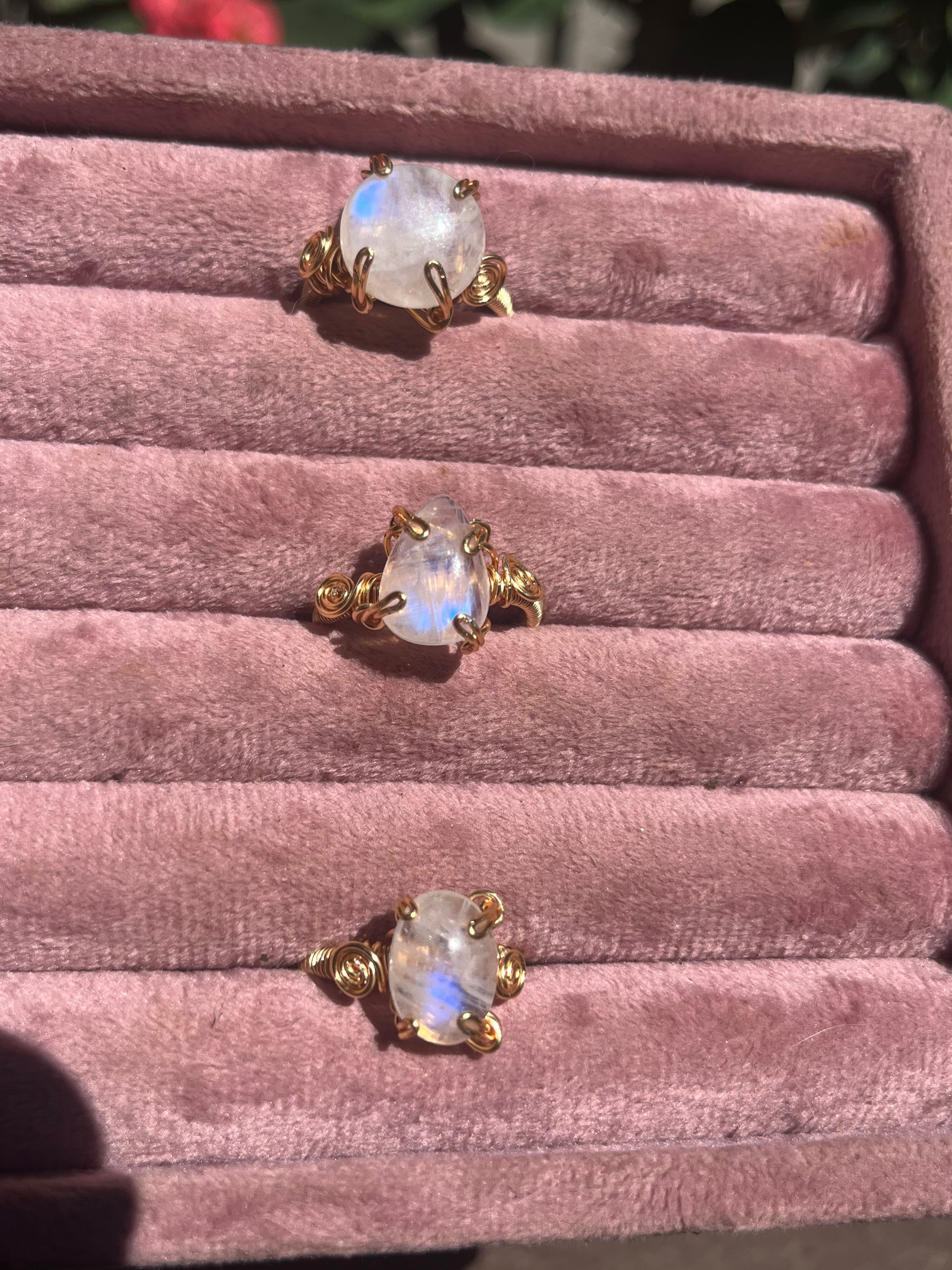 Anillos ajustables hechos con técnica de alambrismo y cabujon de piedra luna grande. El alambre es chapado en oro de 18k.