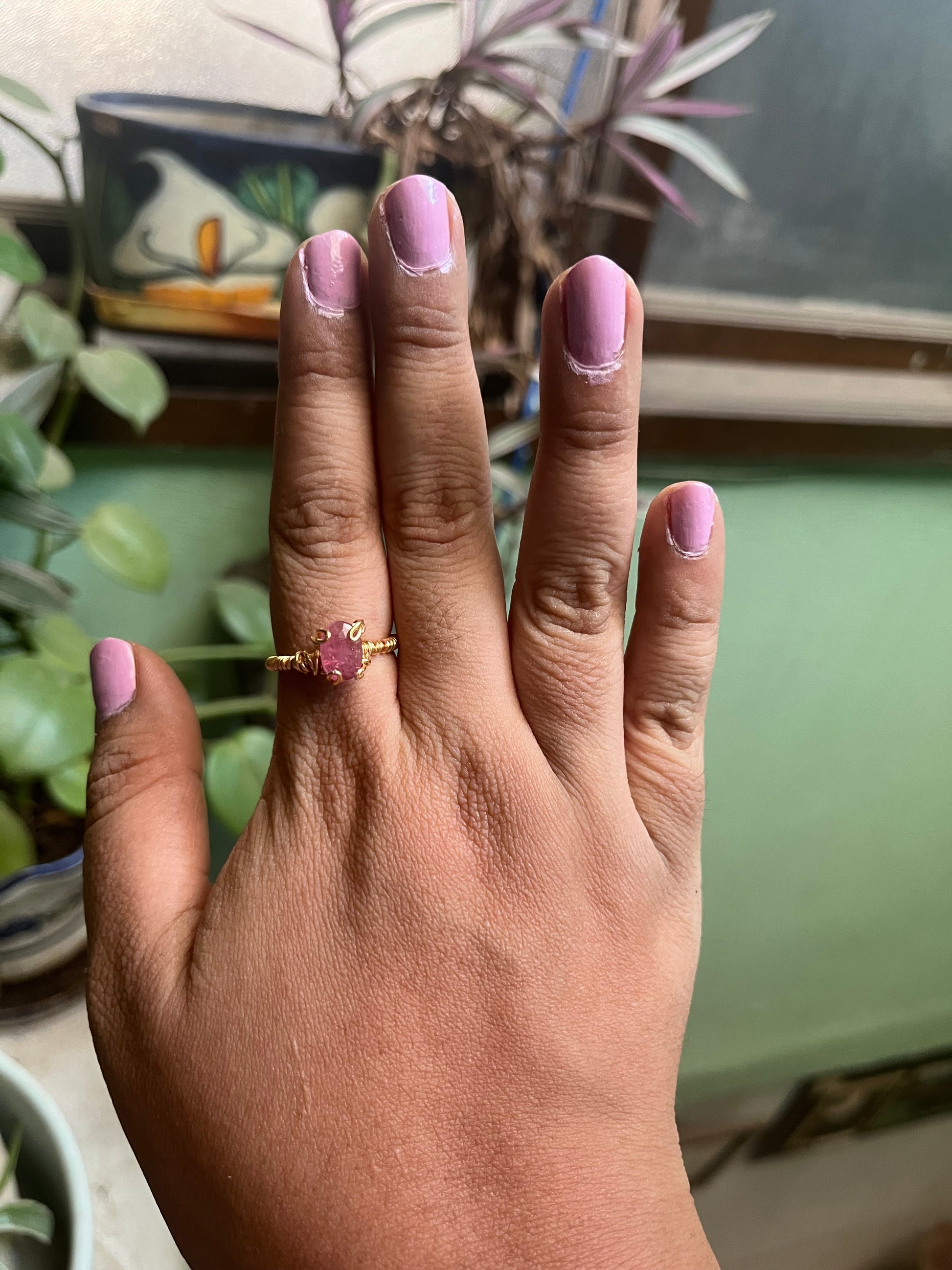 Anillo de zafiro rosa de 8x5 mm montado en base de alambre chapado en oro. Modelo ajustable.