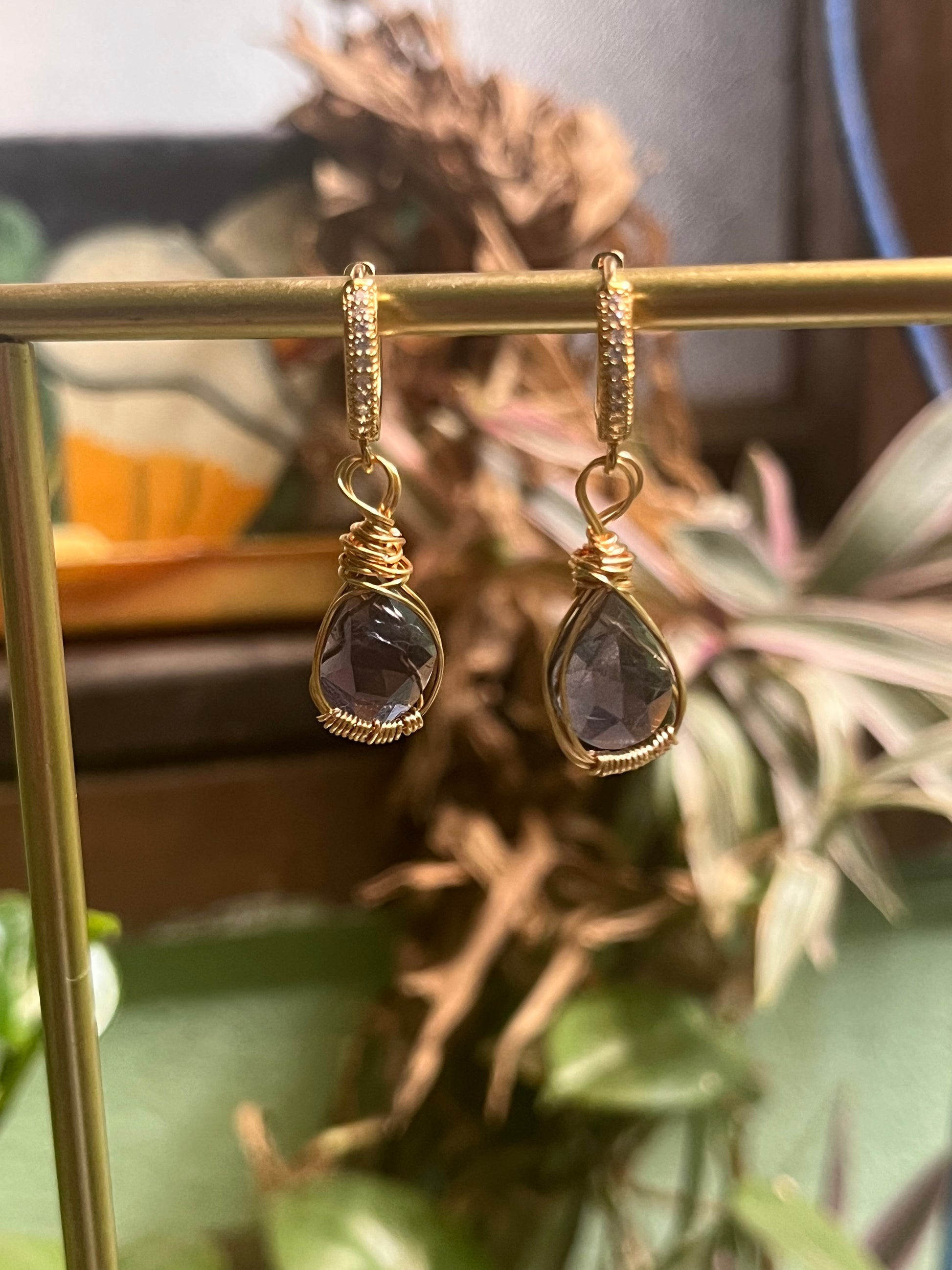 Aretes de iolita ensamblados a mano con base de aretes de chapa de oro y cristales.