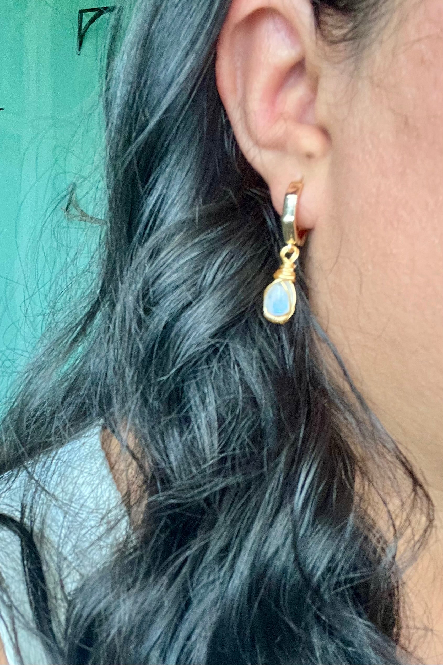 Aretes de piedra luna ensamblados a mano. Todos los componentes son de chapa de oro de 18k