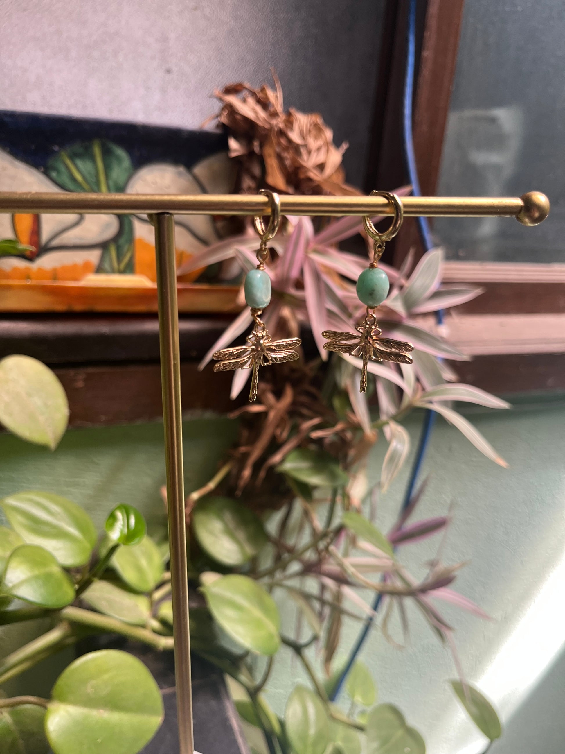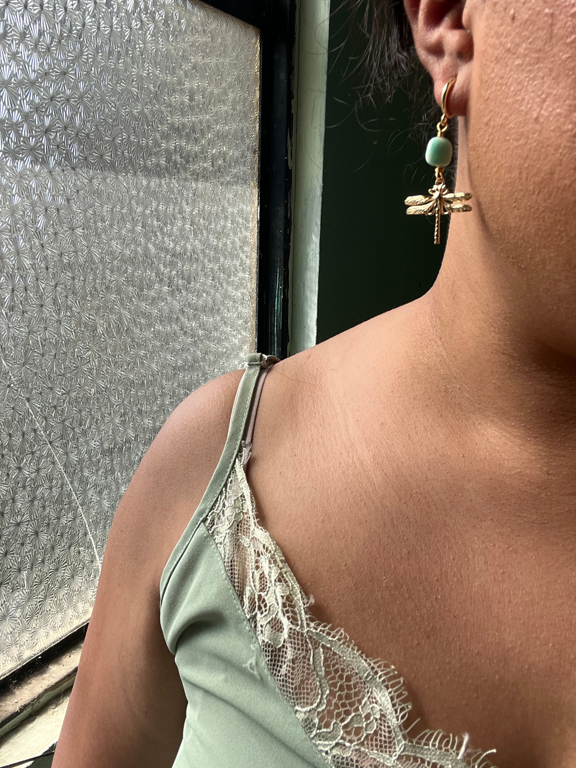 Aretes con cuentas de amazonita, huggies y dije de libélula de chapa de oro de 18k.