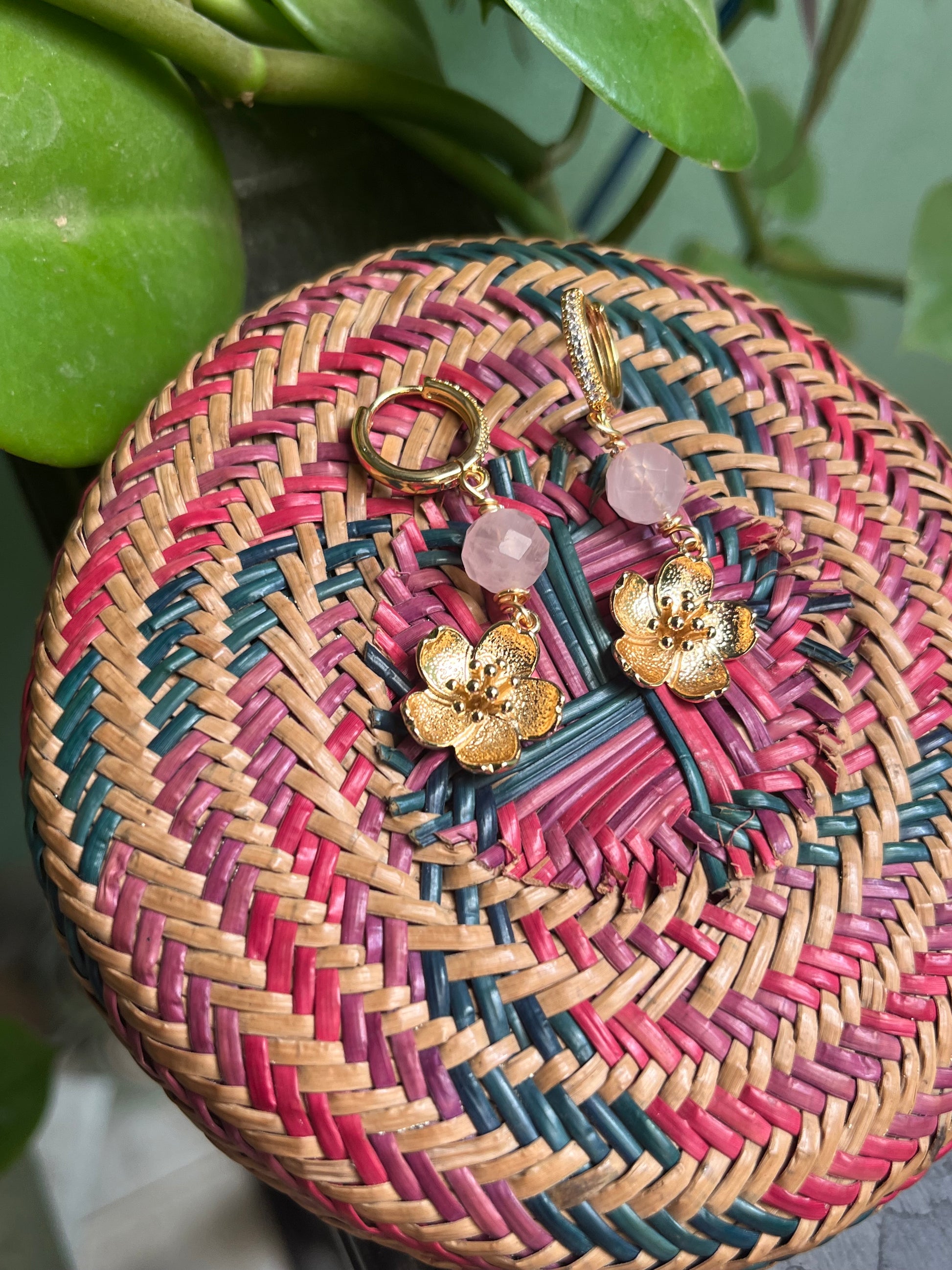 Aretes con base de chapa de oro y zirconio, cuarzo rosa y colgante de magnolia.