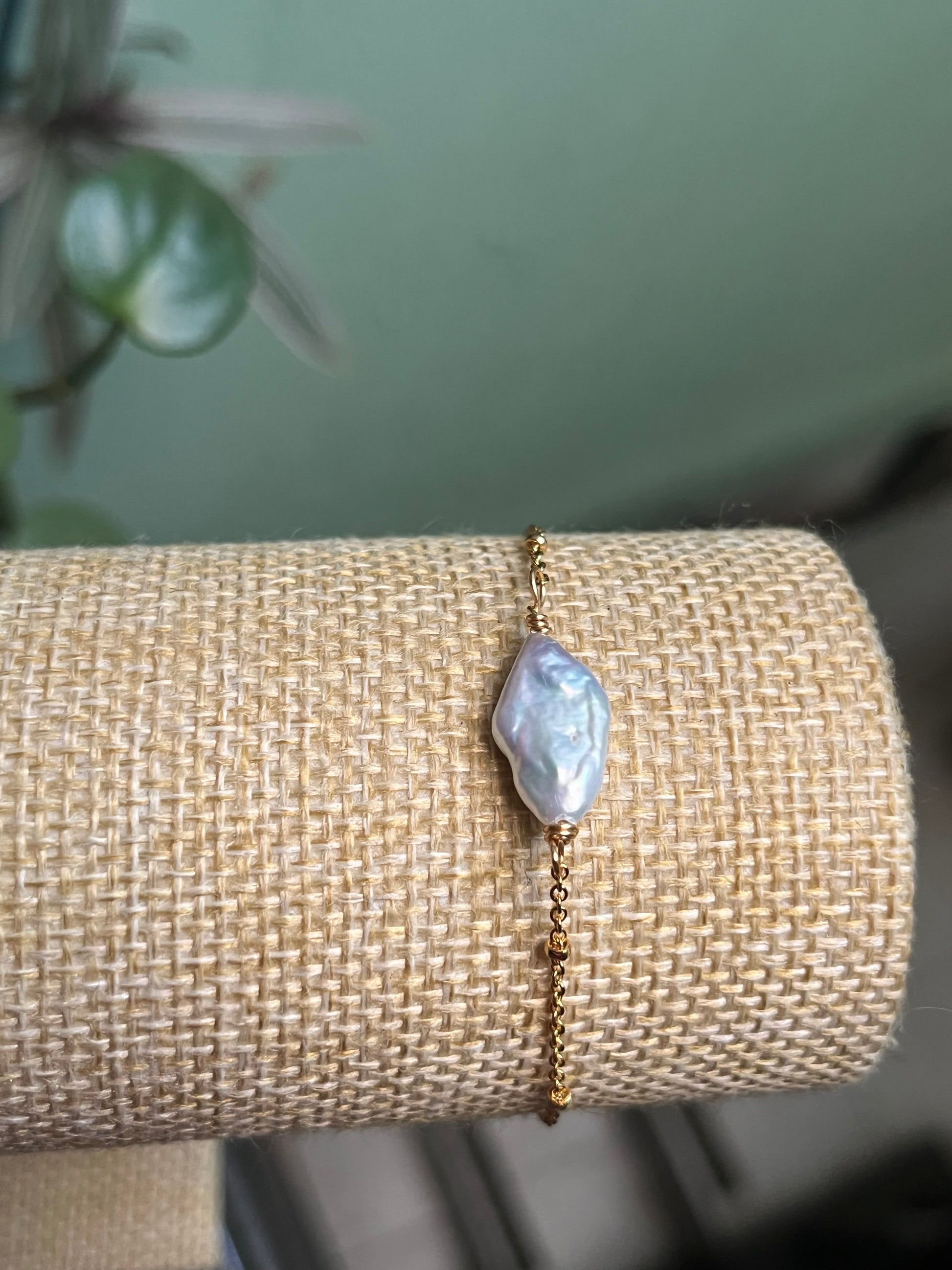 Brazalete con extensor de 3 cm, hecho con cadena de chapa de oro y perla de rio en forma de rombo