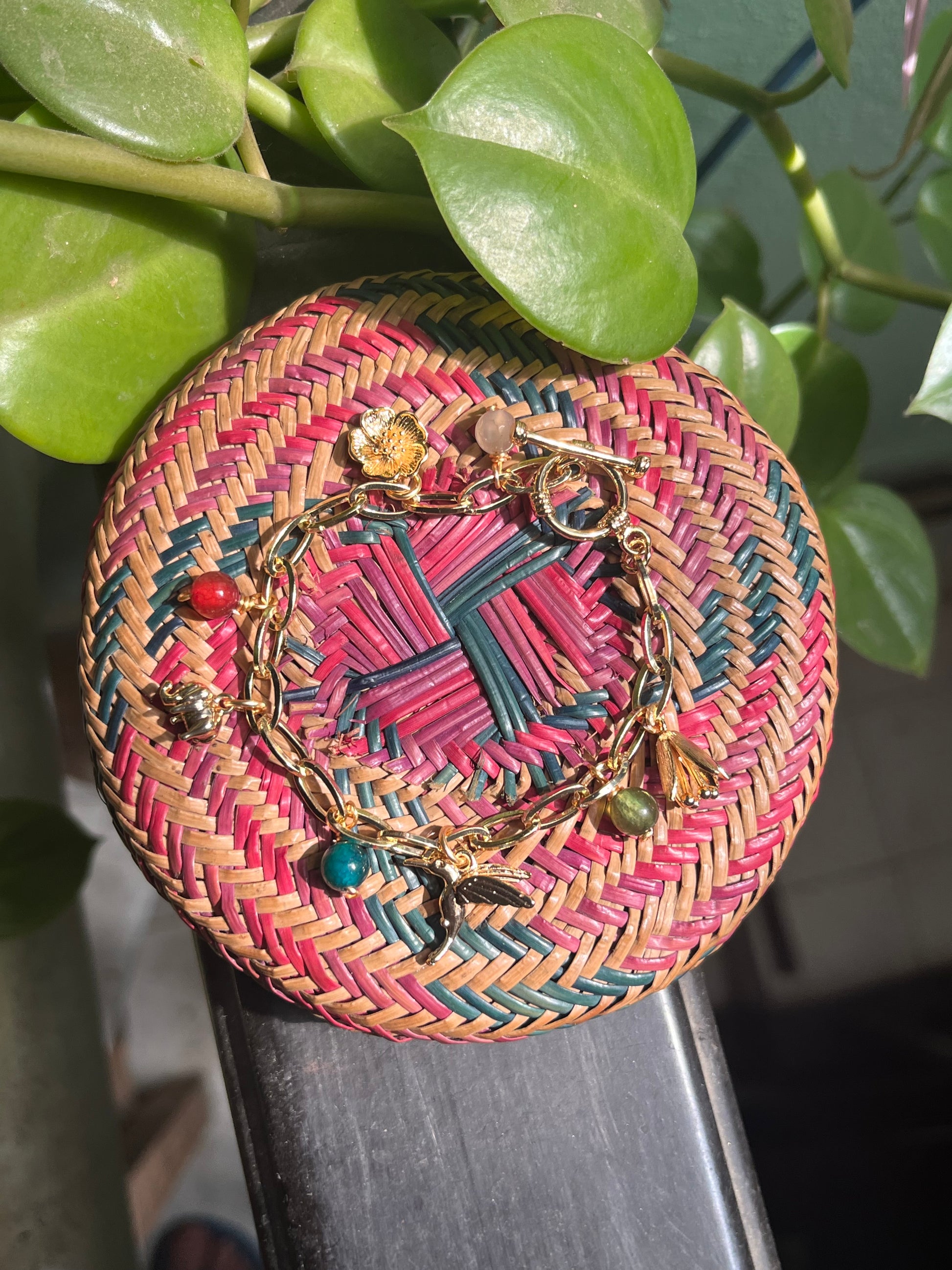 Brazalete de 17 cm con charms y colgantes de ágatas de diversos colores. La cadena y los componentes son de chapa de oro de 18k.
