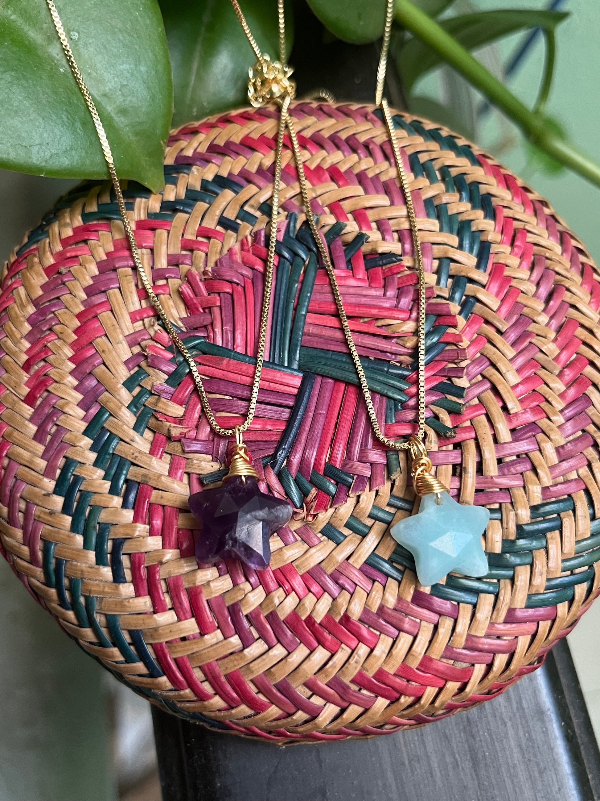 Collar con cadena y componentes de chapa de oro de 18k y dije en forma de estrella ensamblado a mano.