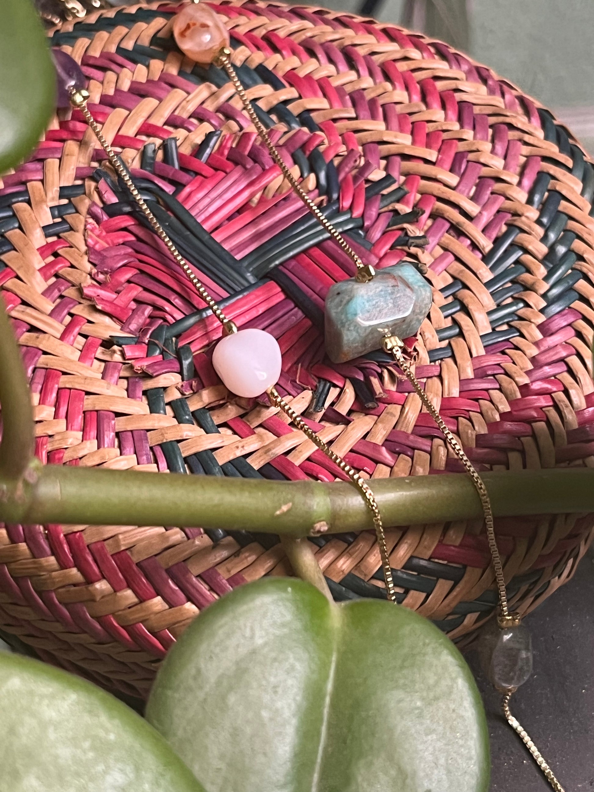 Collar de 60 cm de chapa de oro con cuarzos entramados en la cadena y un mini nugget de amazonita.