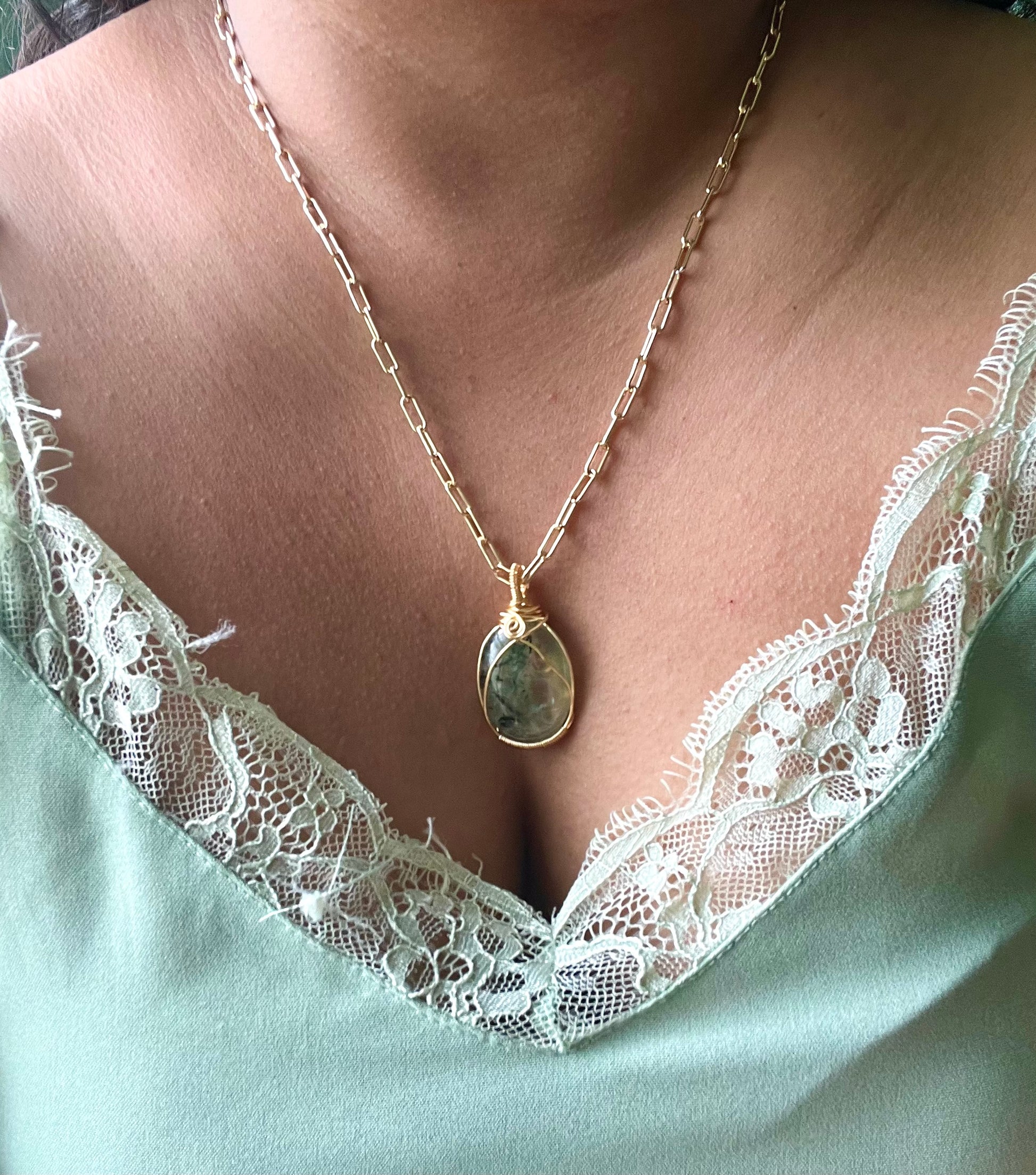 Collar ensamblado a mano con cadena chapada en oro de 18k y dije artesanal de prenhita de 3.5 cm.