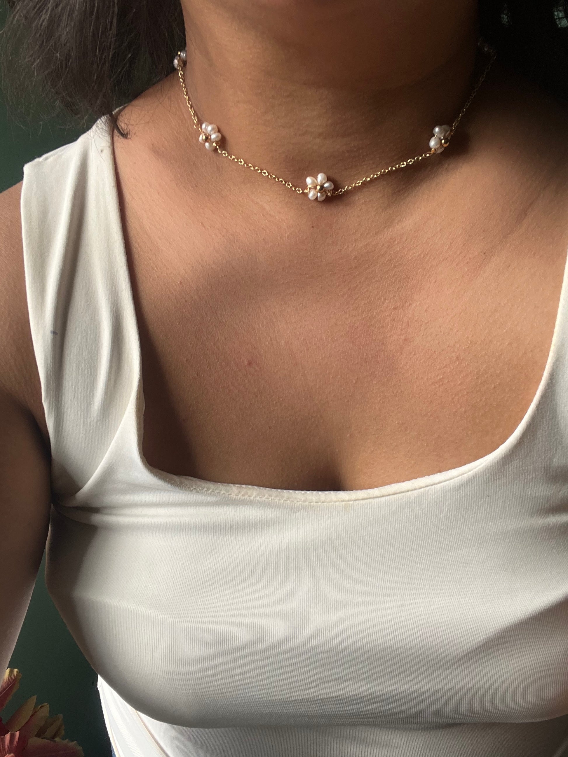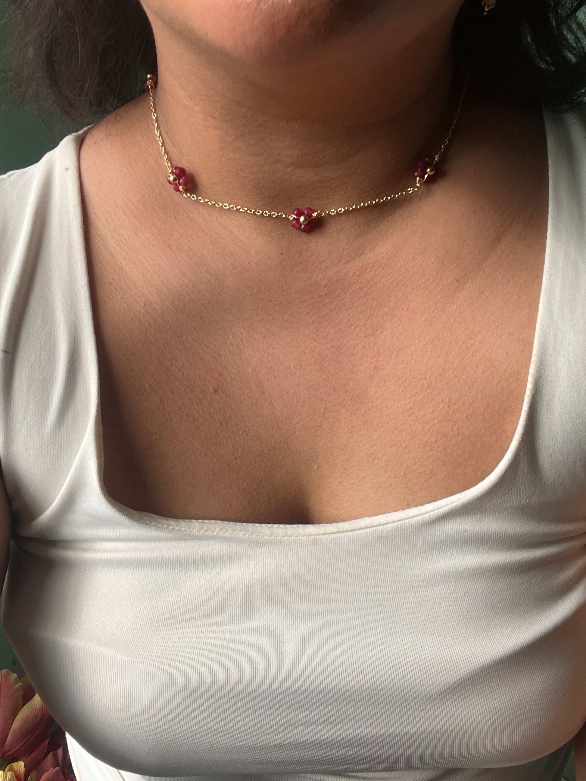 Collar hecho con flores bordadas completamente a mano con diferentes cuarzos y cristales. Cadena de chapa de oro de 18k