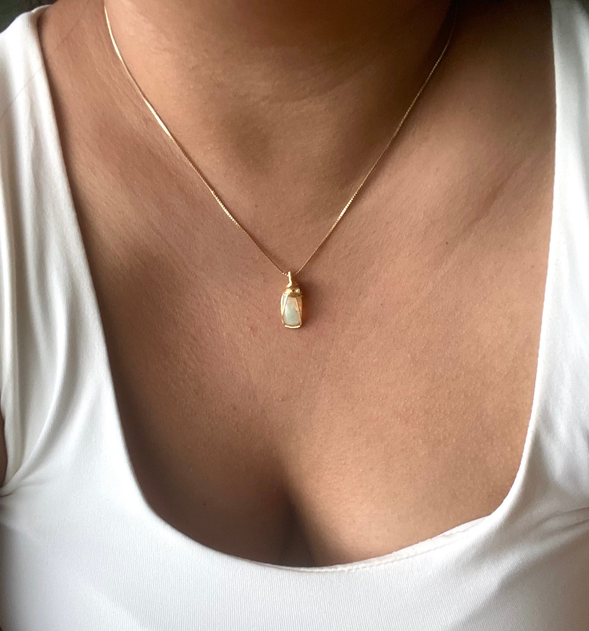 Collar elaborado a mano con cadena chapada en oro de 18k y dije de ópalo natural en forma rectangular.