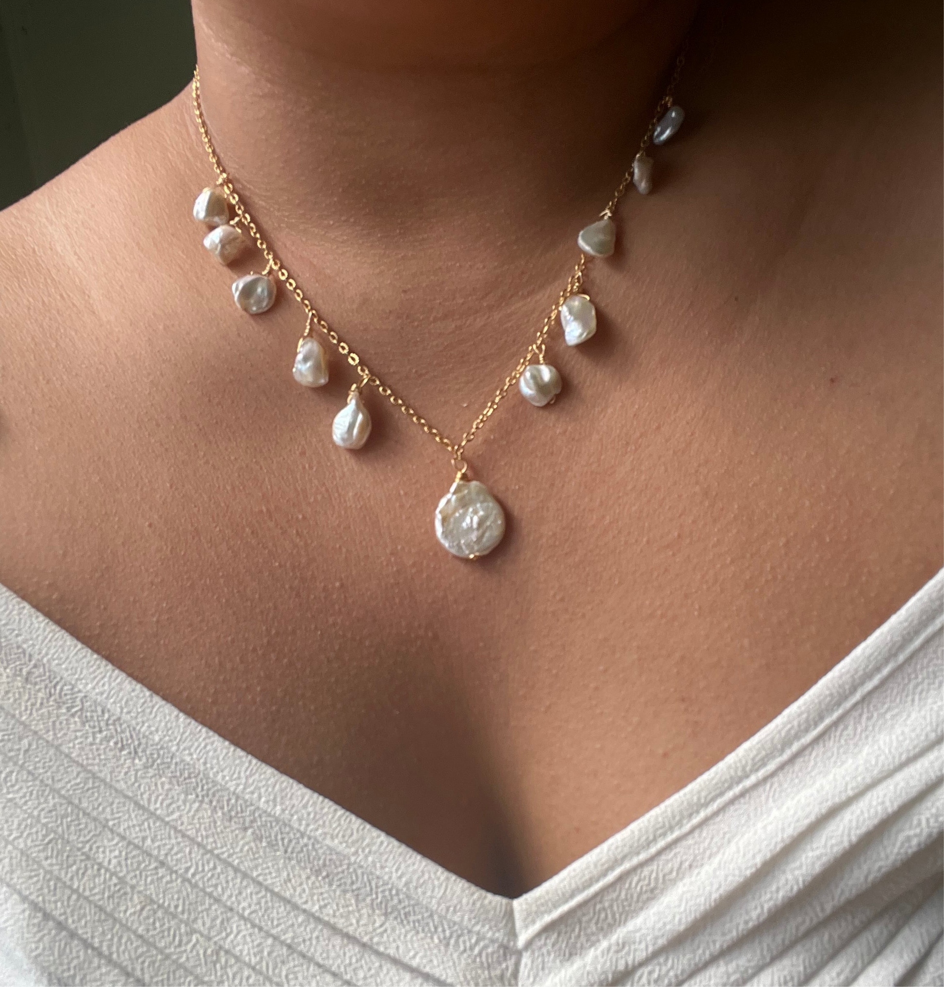 Collar de 40 cm con colgantes de perla biwa. La cadena y componentes son chapa de oro de 18k