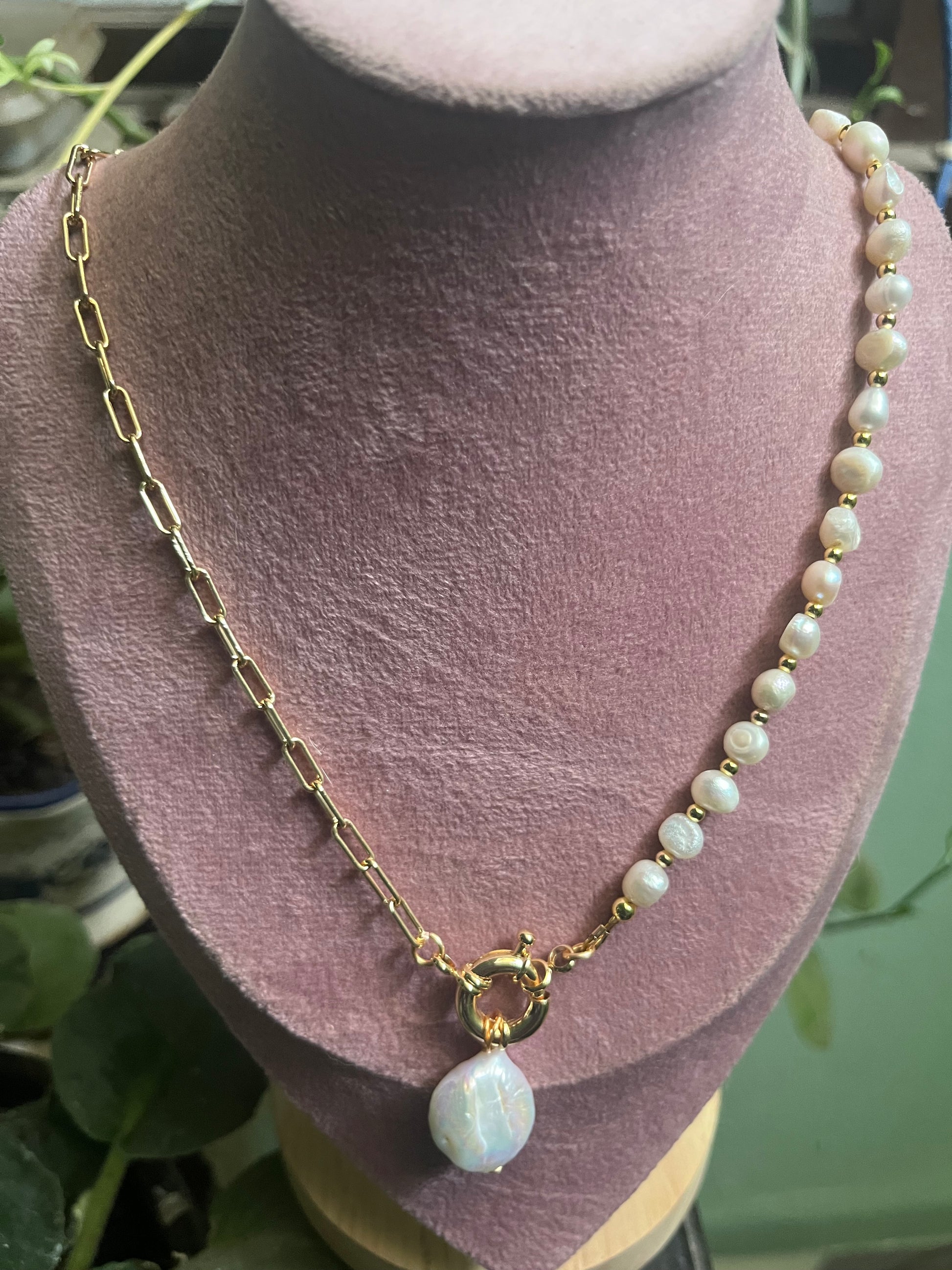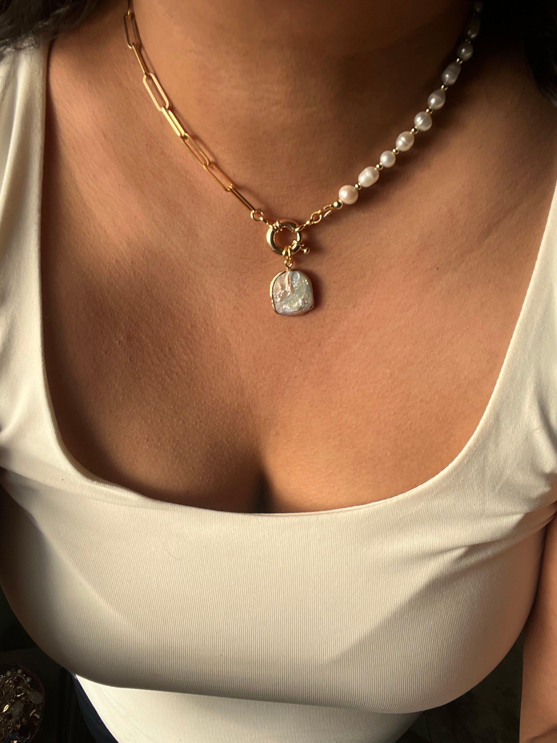 Collar con cadena de chapa de oro de 18k y perla de río de 6 mm. Tiene broche marinero y colgante de madre perla.