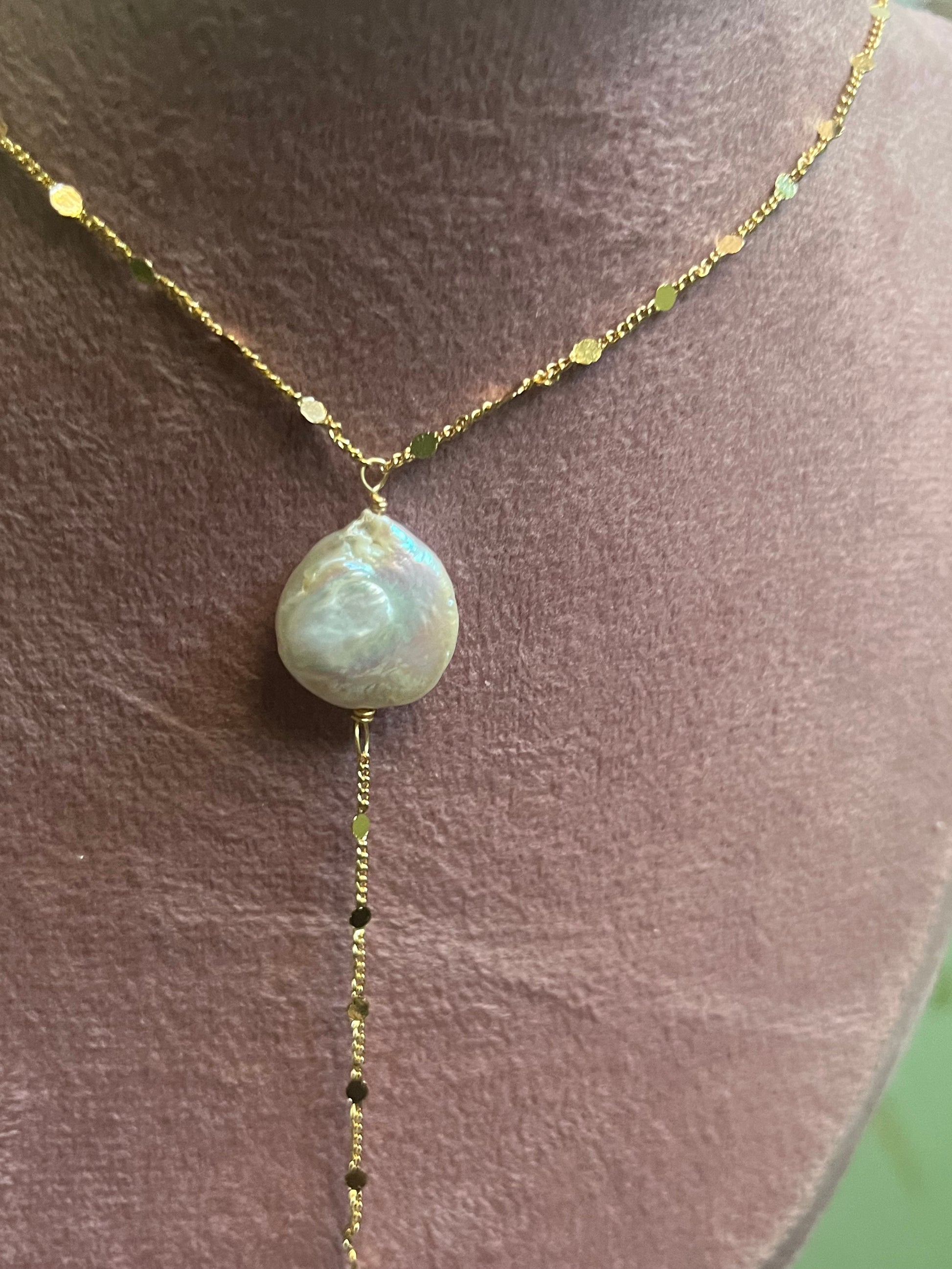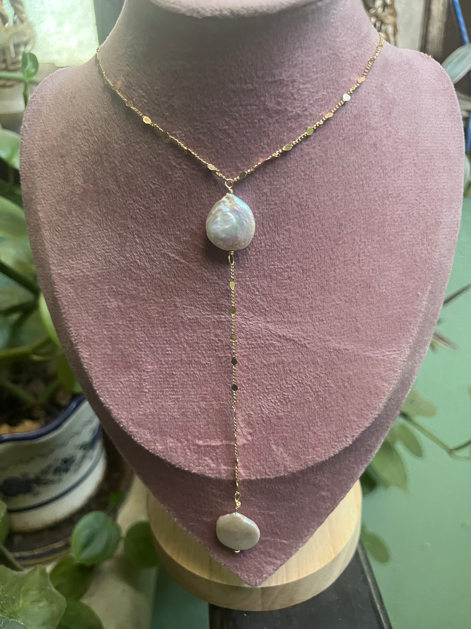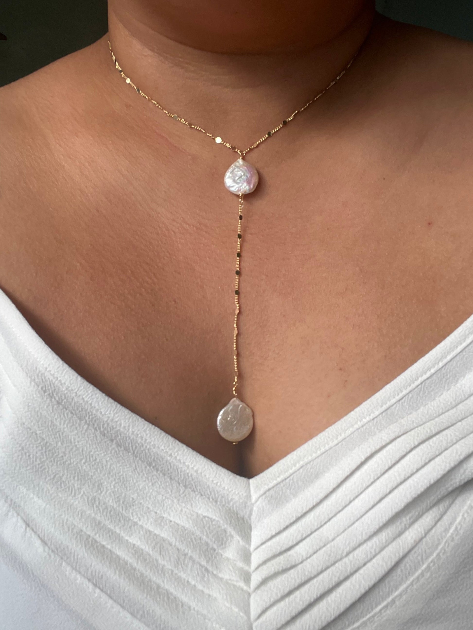 Collar tipo corbatín con dos dijes de perla biwa. La cadena y componentes son de chapa de oro de 18k.