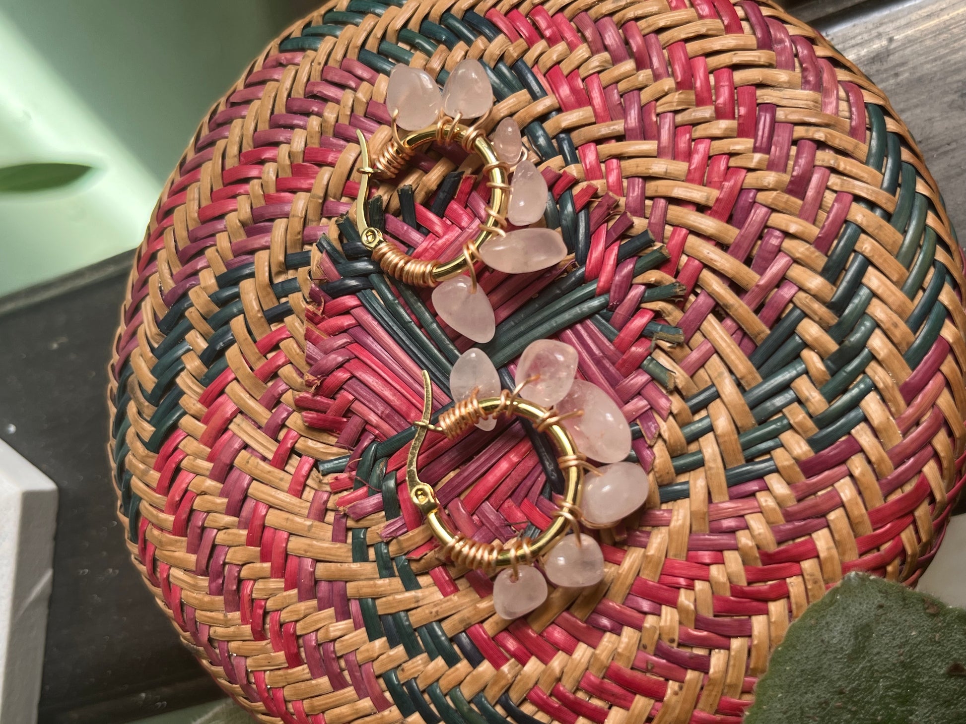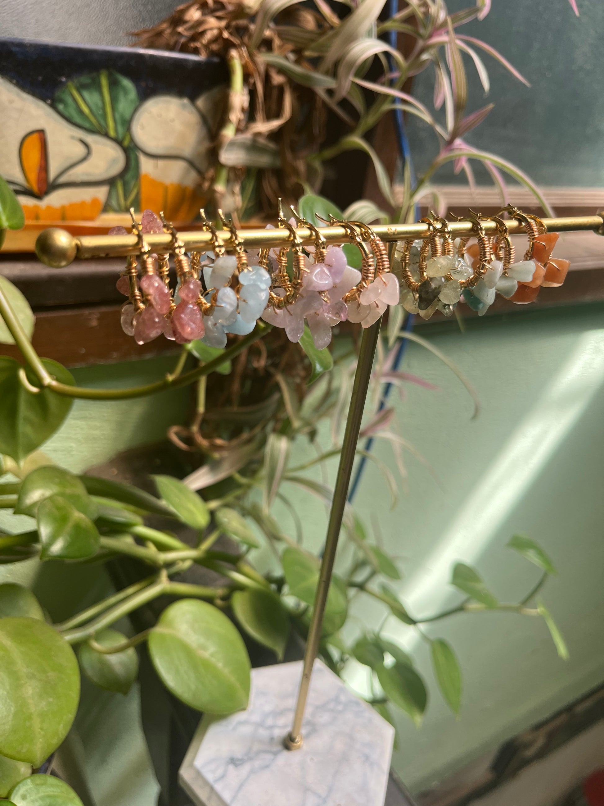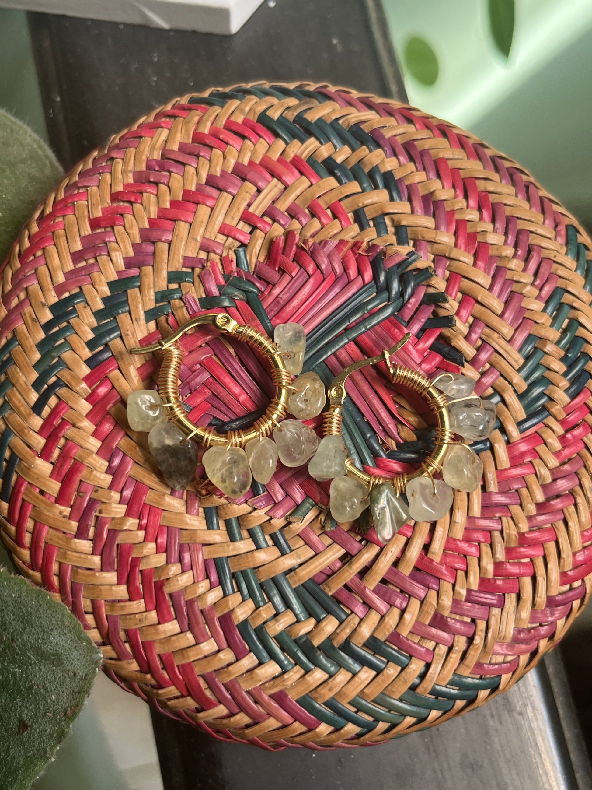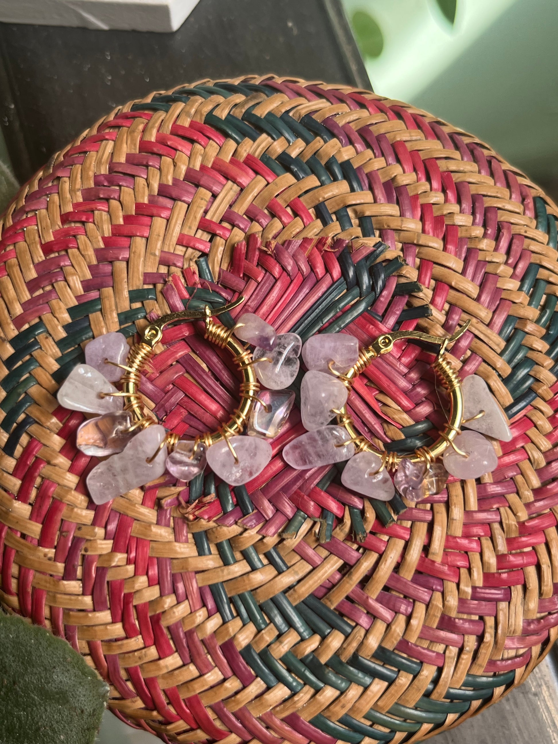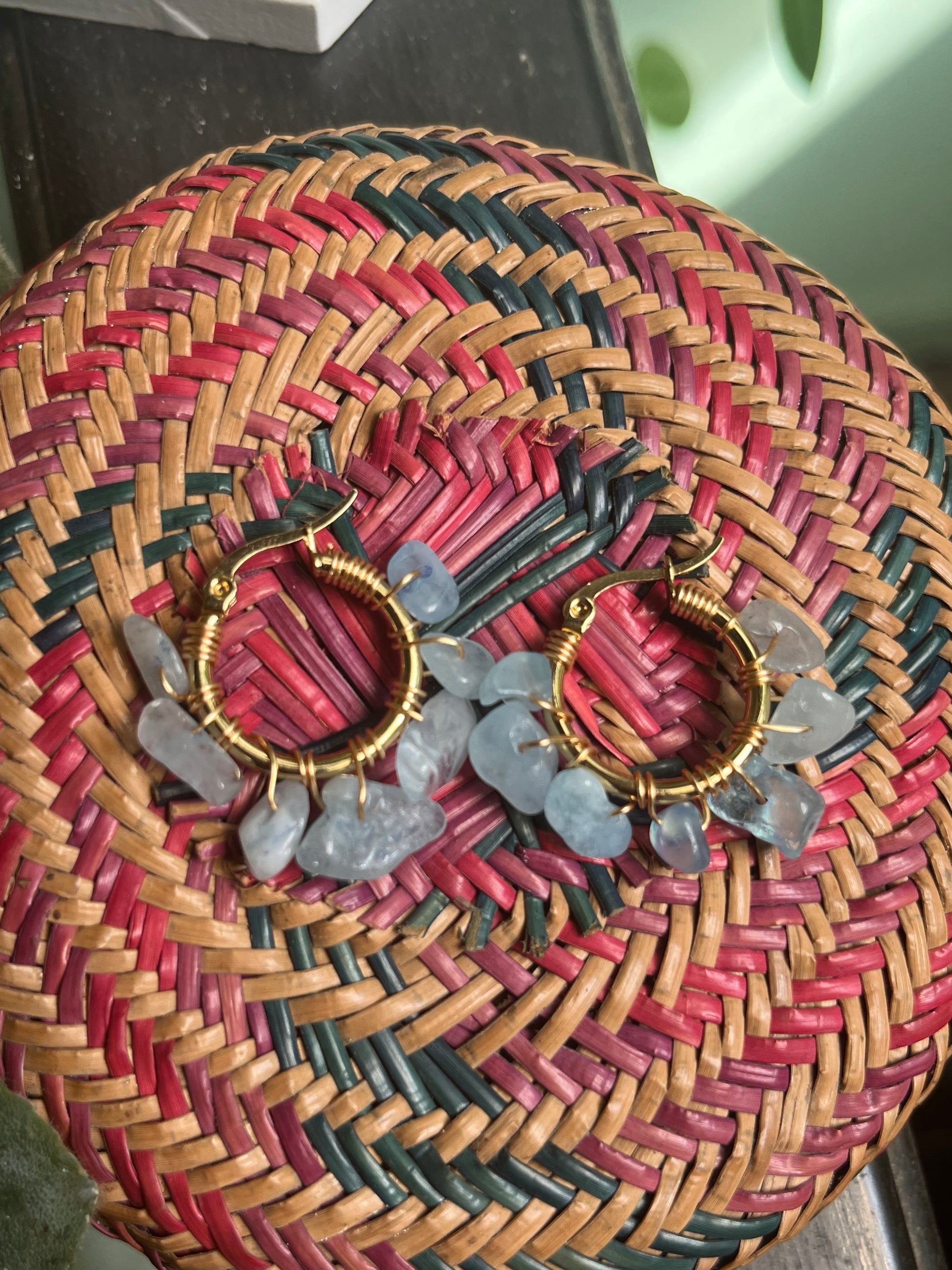 Arracadas de acero inoxidable bordadas a mano con alambre chapado en oro de 18k. Llevan chips de cuarzo a elegir