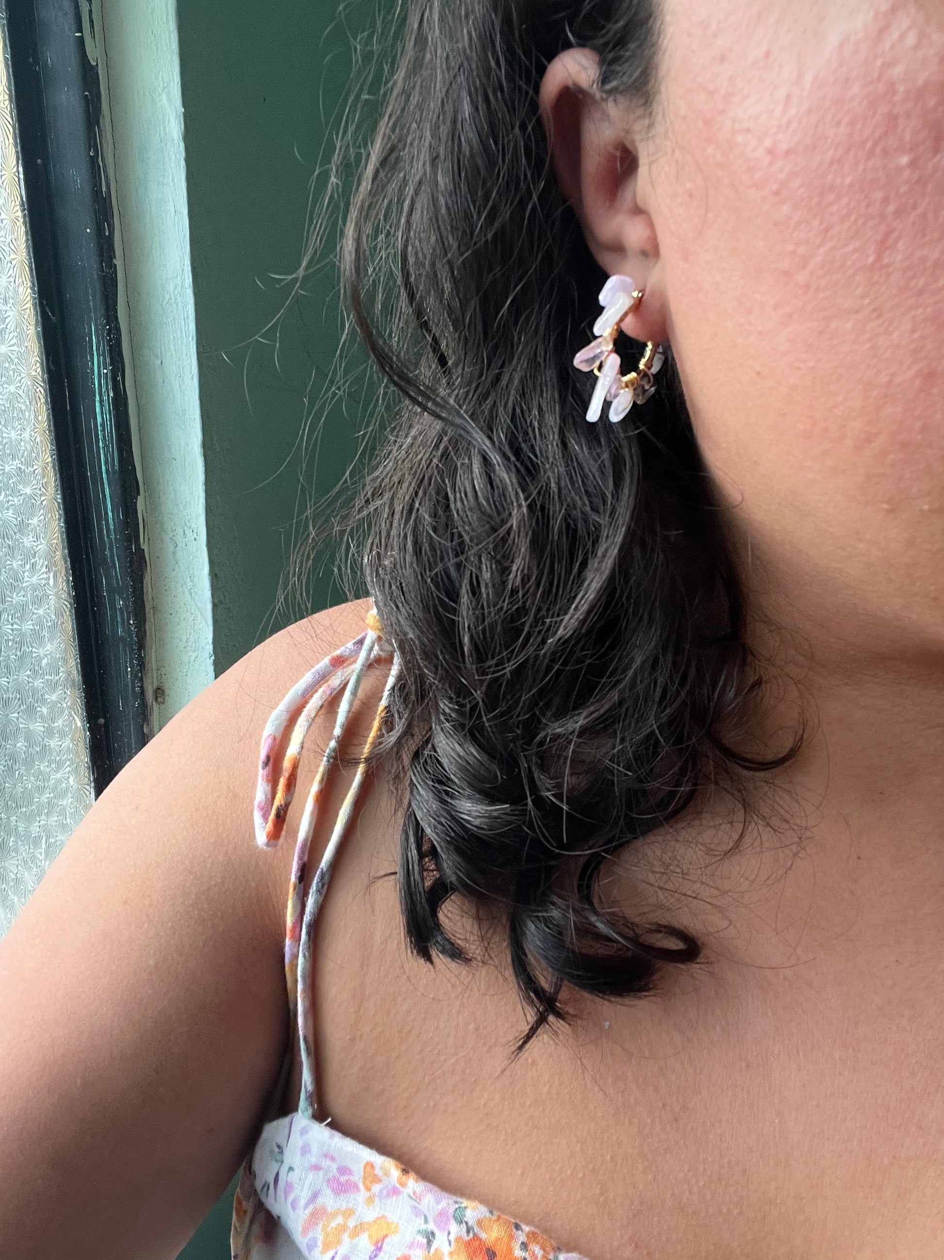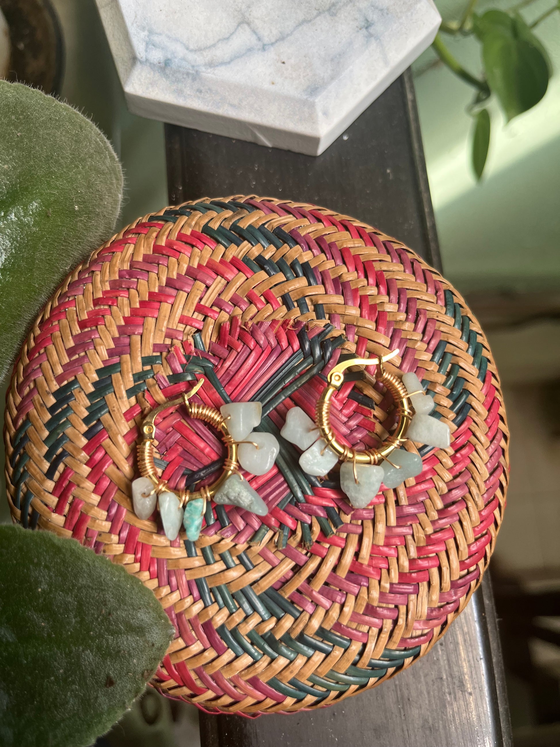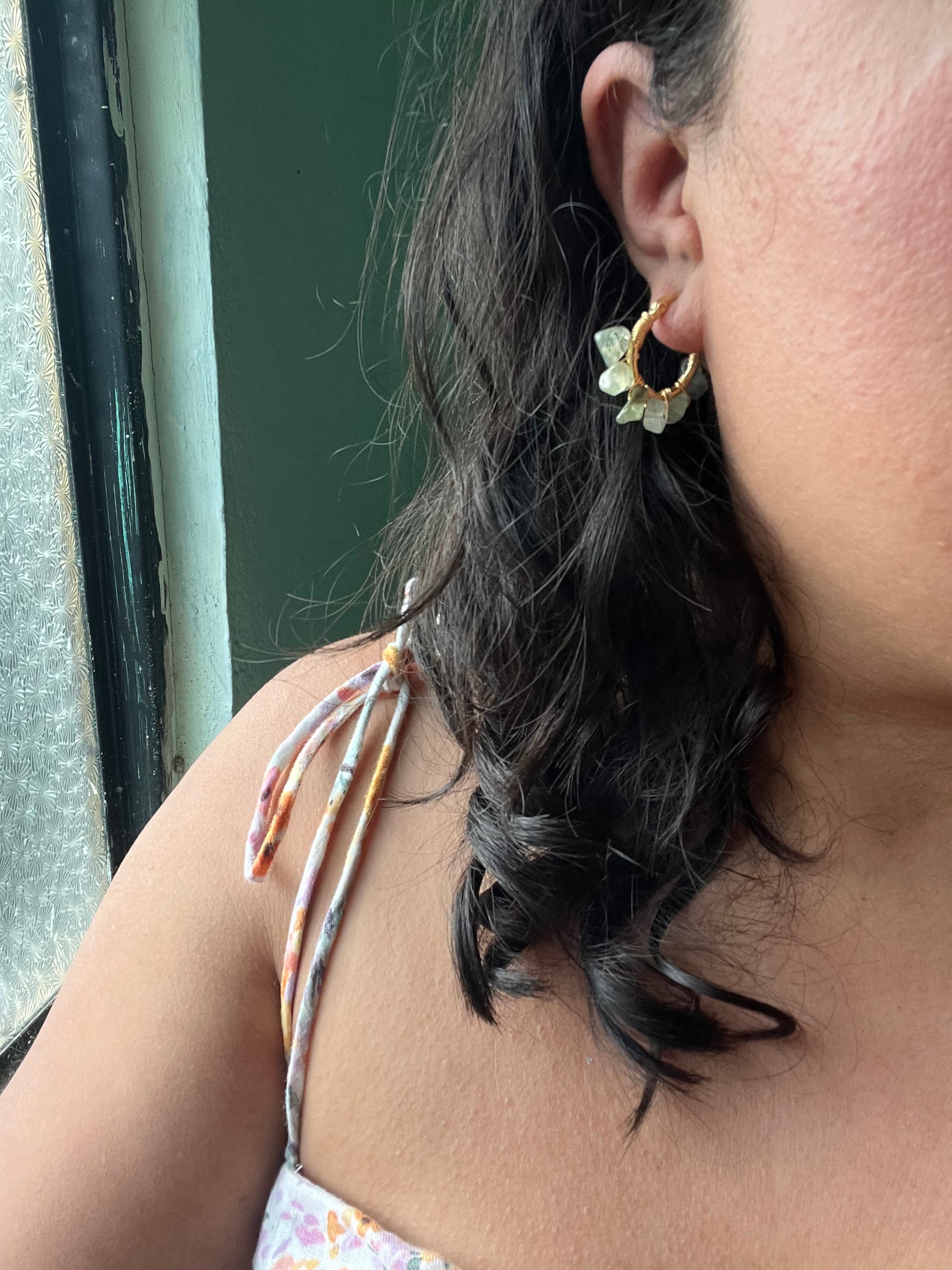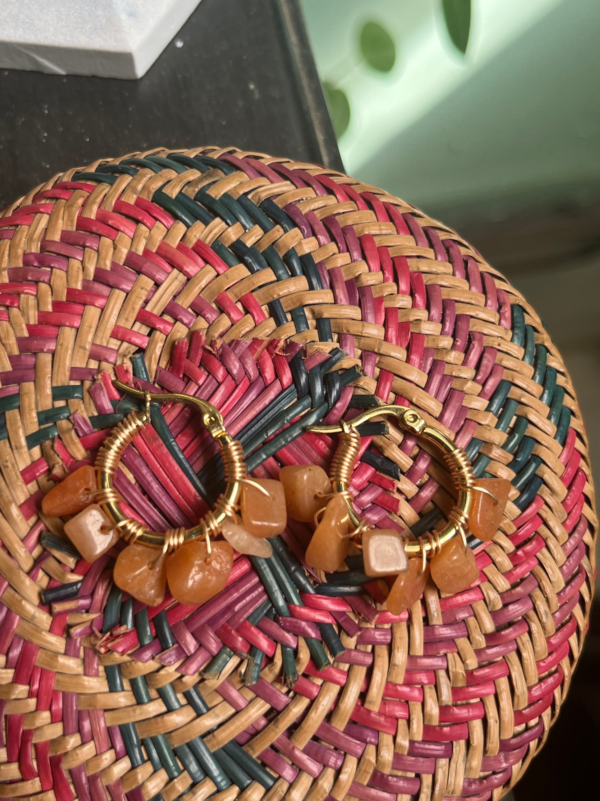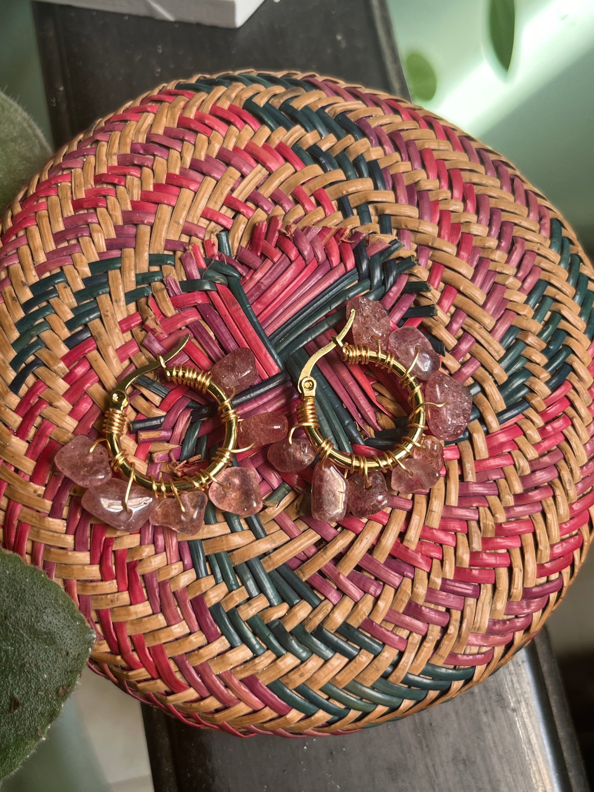 Arracadas de acero inoxidable bordadas a mano con alambre chapado en oro de 18k. Llevan chips de cuarzo a elegir