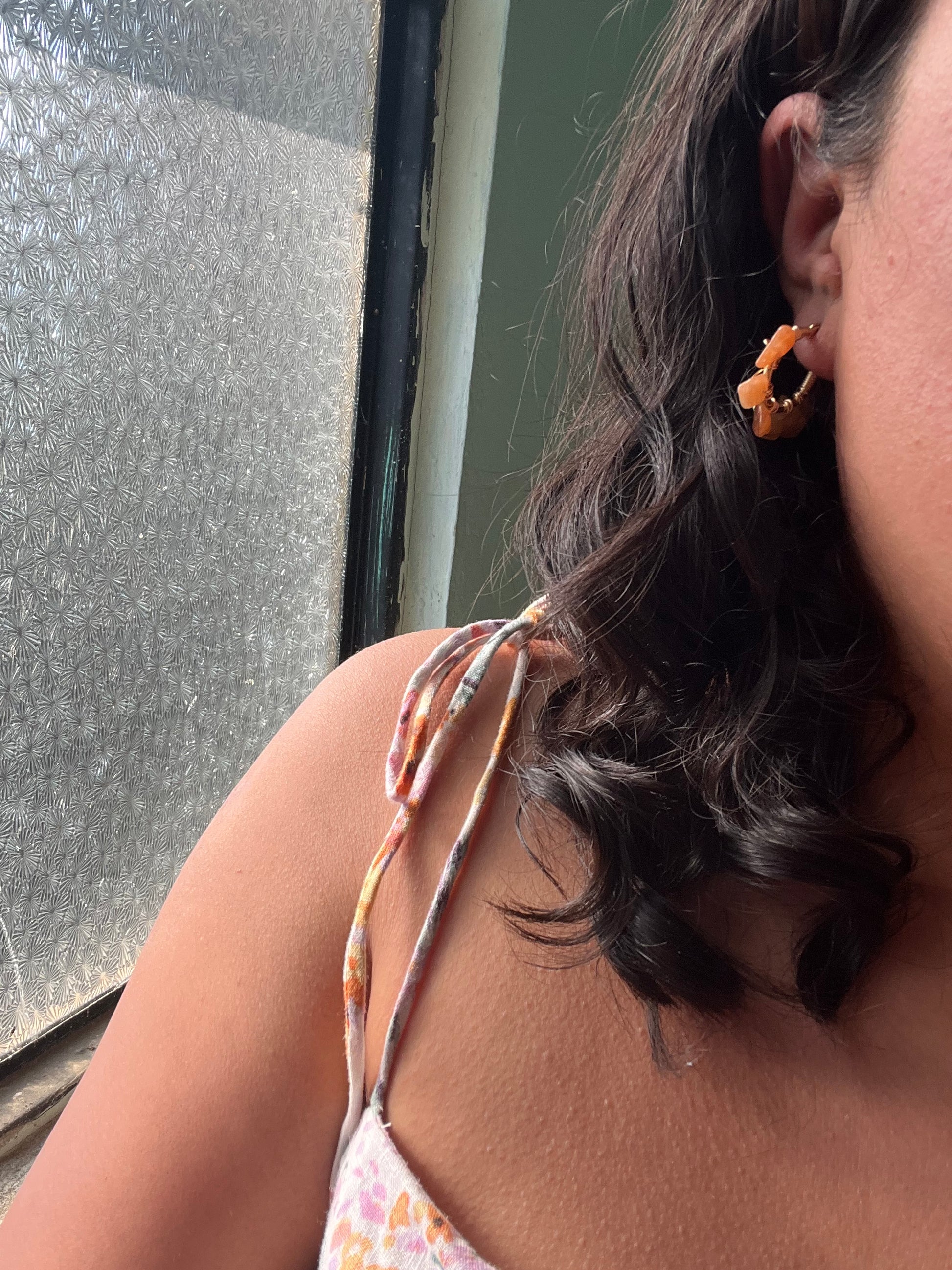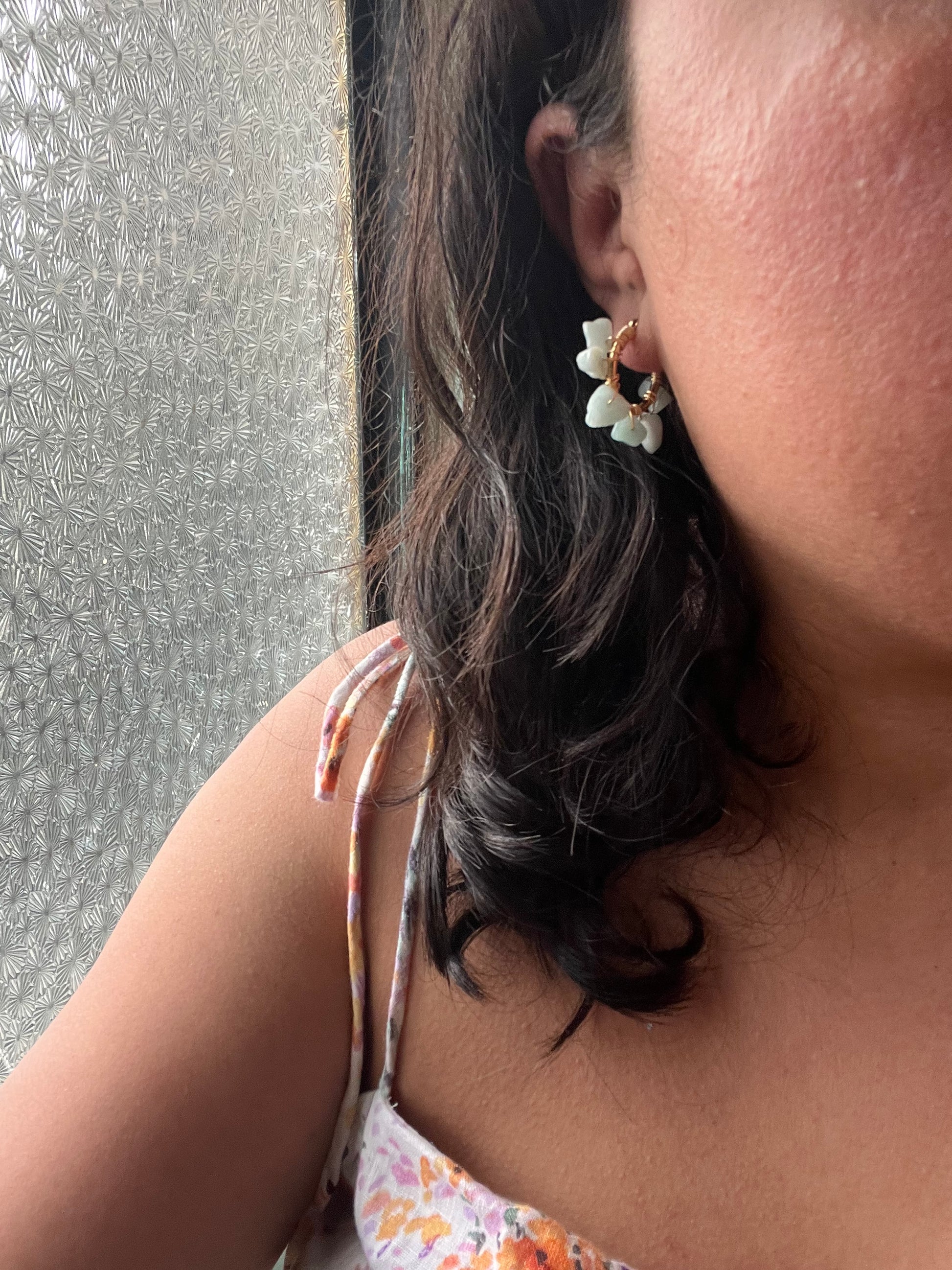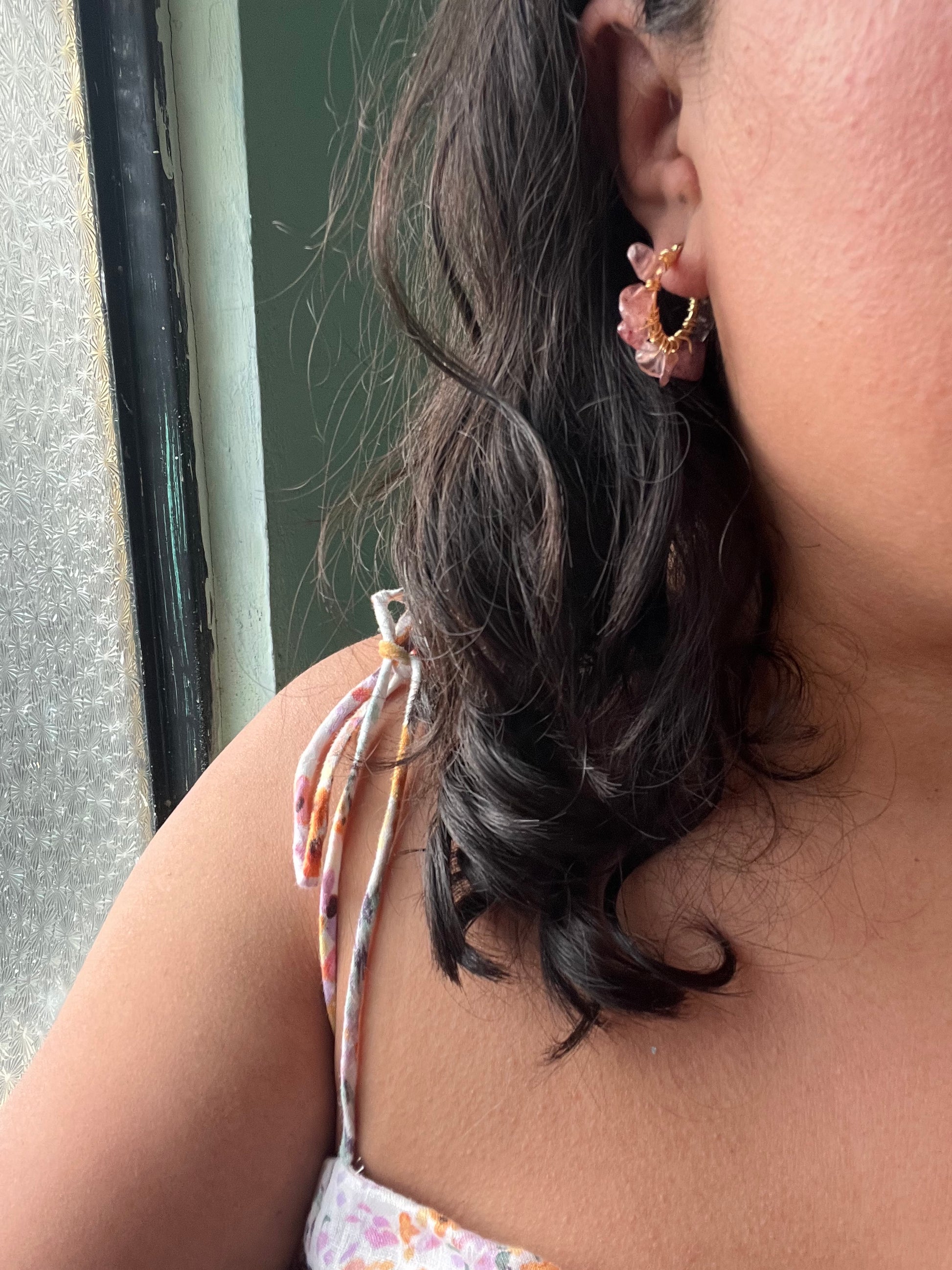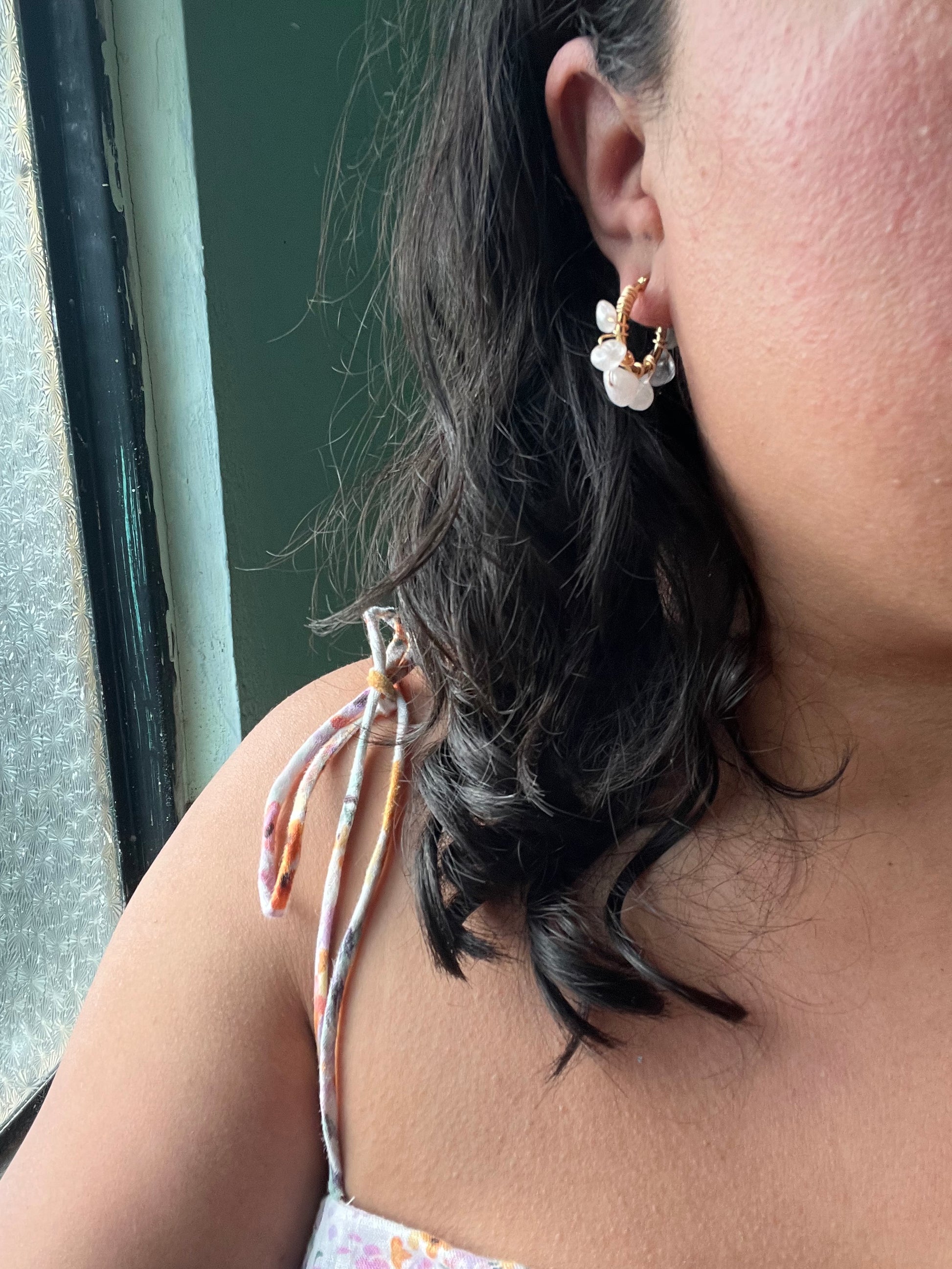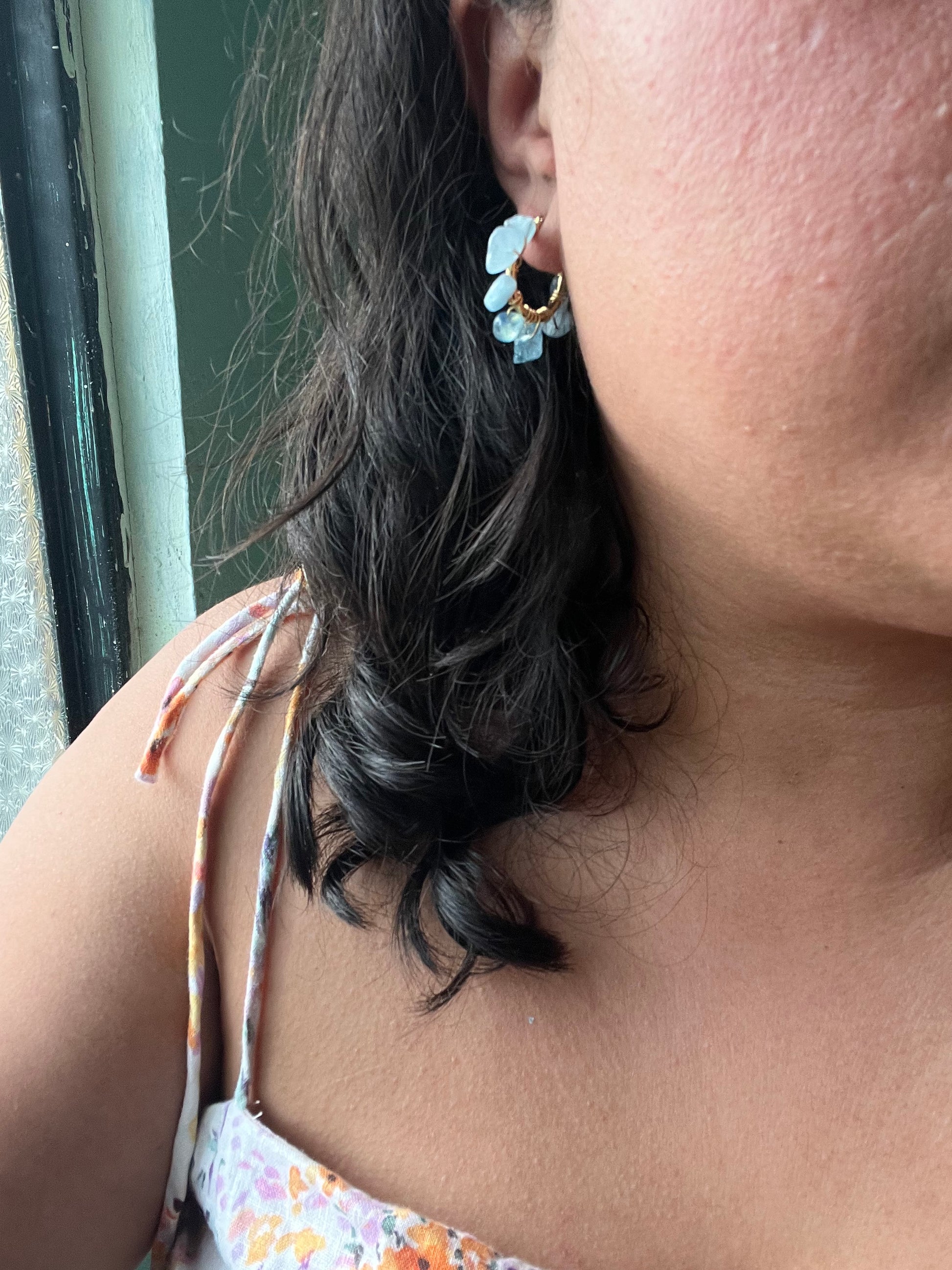 Arracadas de acero inoxidable bordadas a mano con alambre chapado en oro de 18k. Llevan chips de cuarzo a elegir