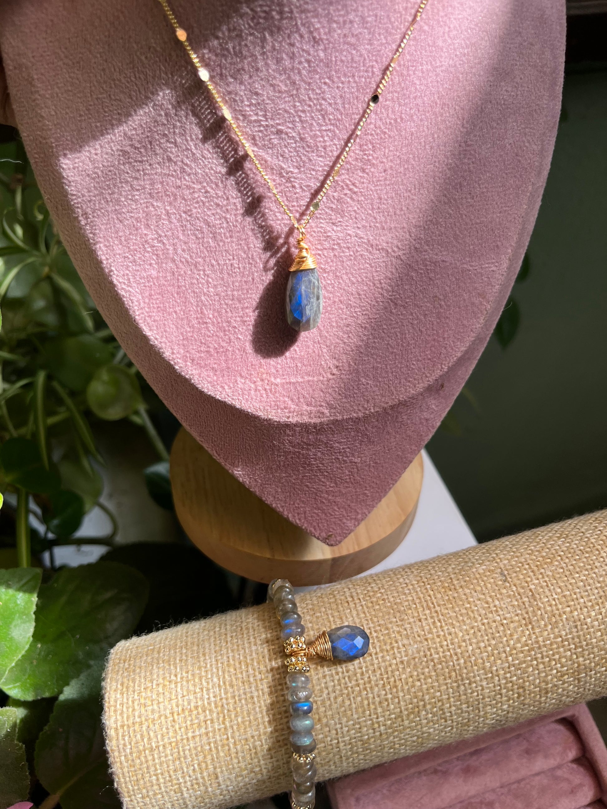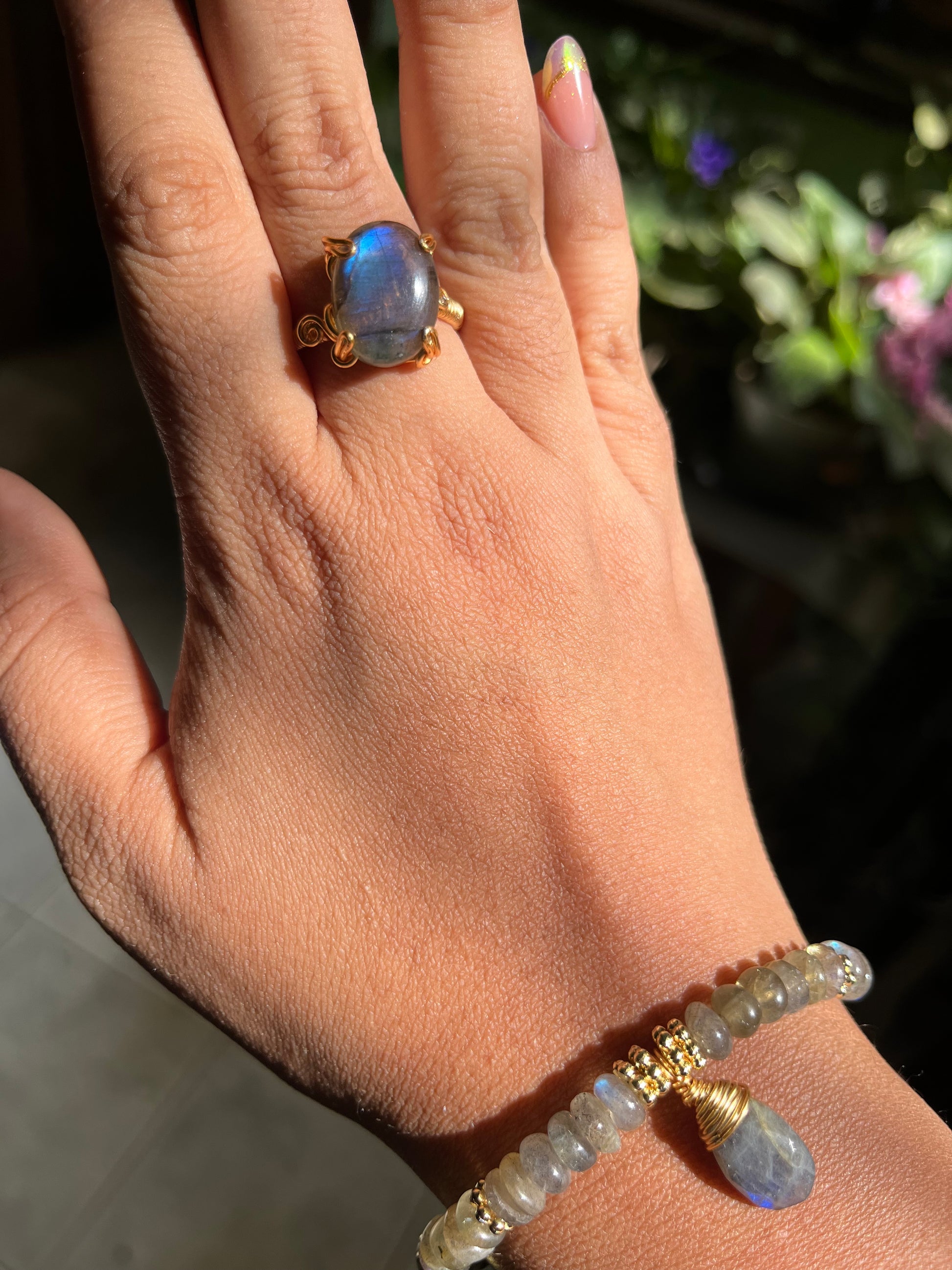 Set de 3 piezas: brazalete, collar y anillo ajustable de labradorita.