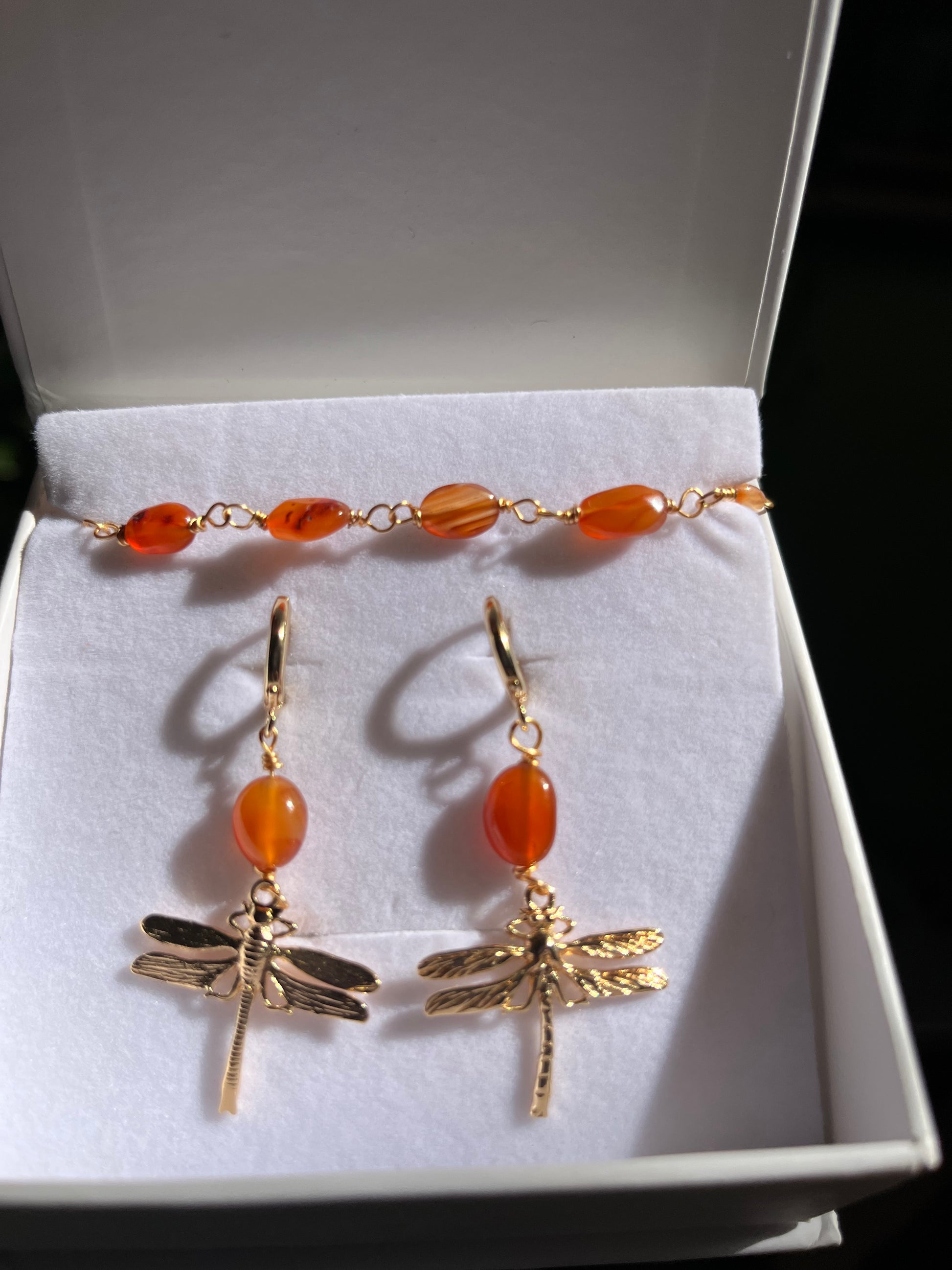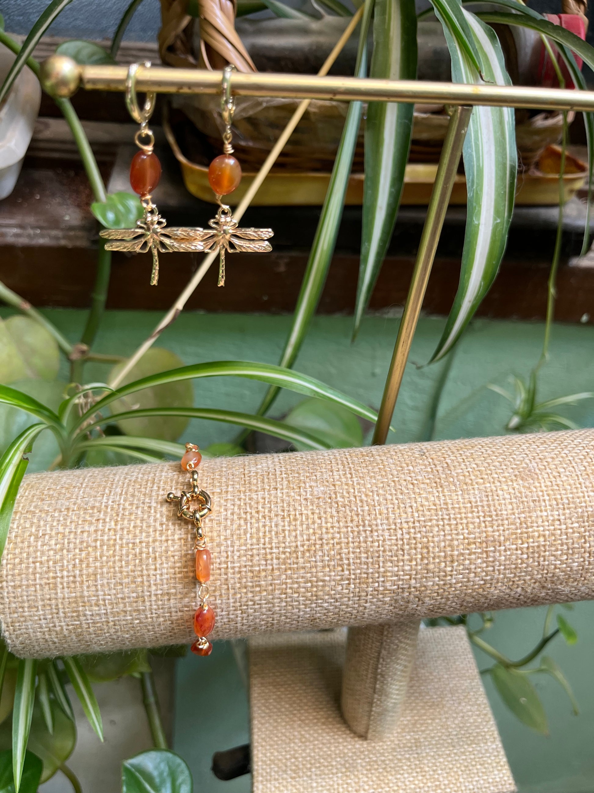 Set de dos piezas: aretes y brazalete elaborados con cornalina y componentes de chapa de oro de 18k