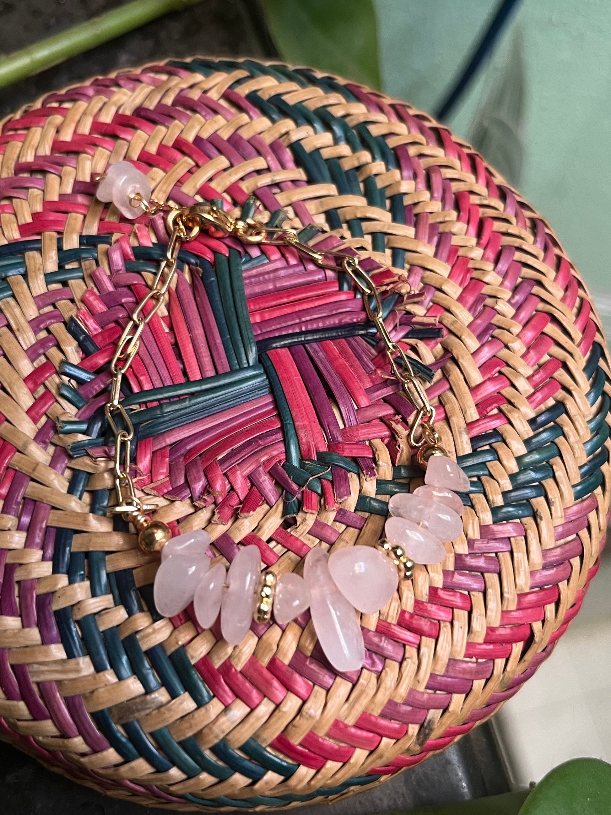 Brazalete con extensor de 2 cm y cadena chapada en oro de 18 k con chips de cuarzo a elegir.