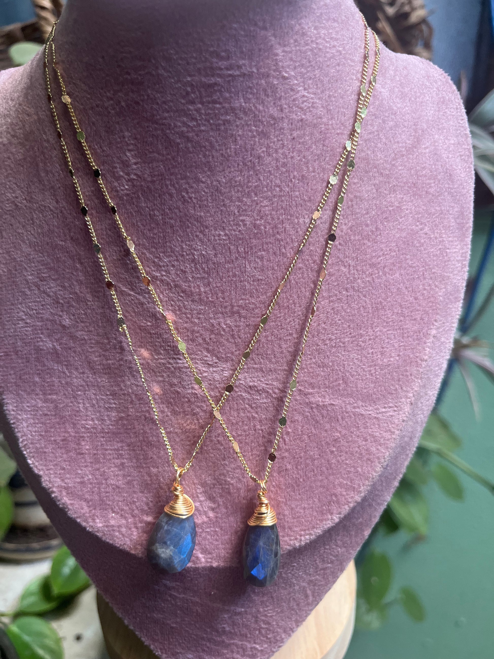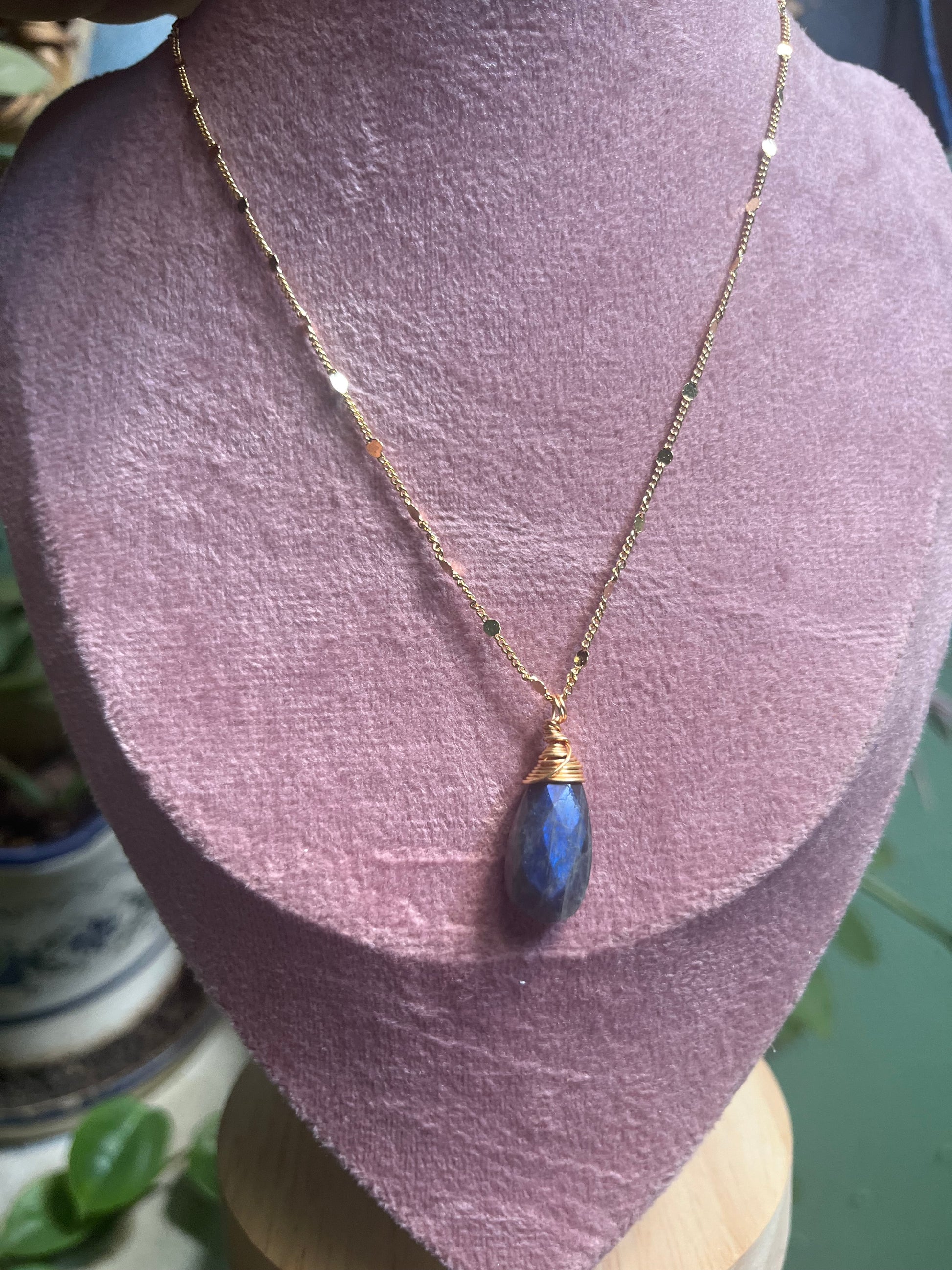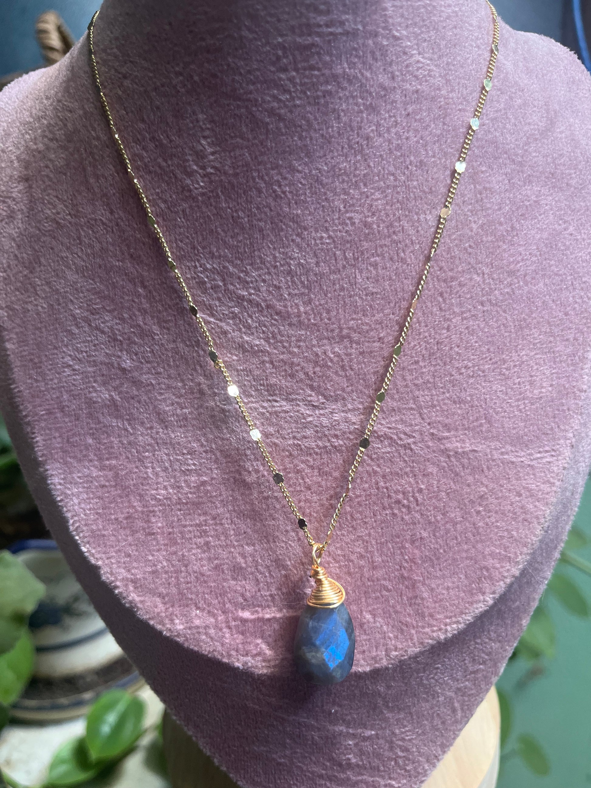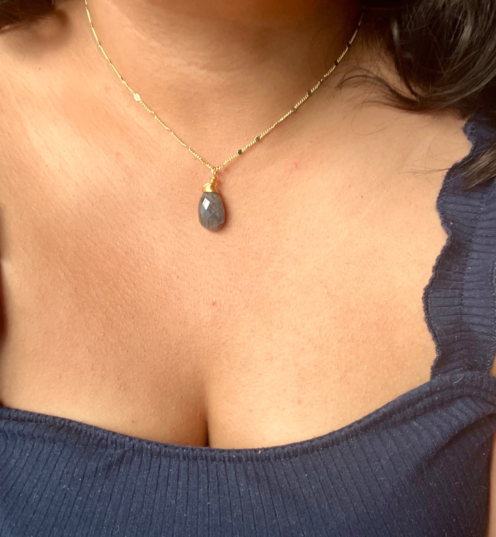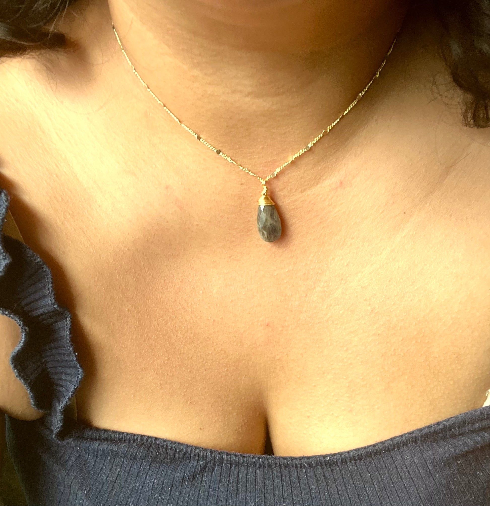 Collar con colgante de labradorita de aprox. 2.2 cm en forma de gota. Cadena de chapa de oro con longitud de 40 cm y extensor de 5 cm.