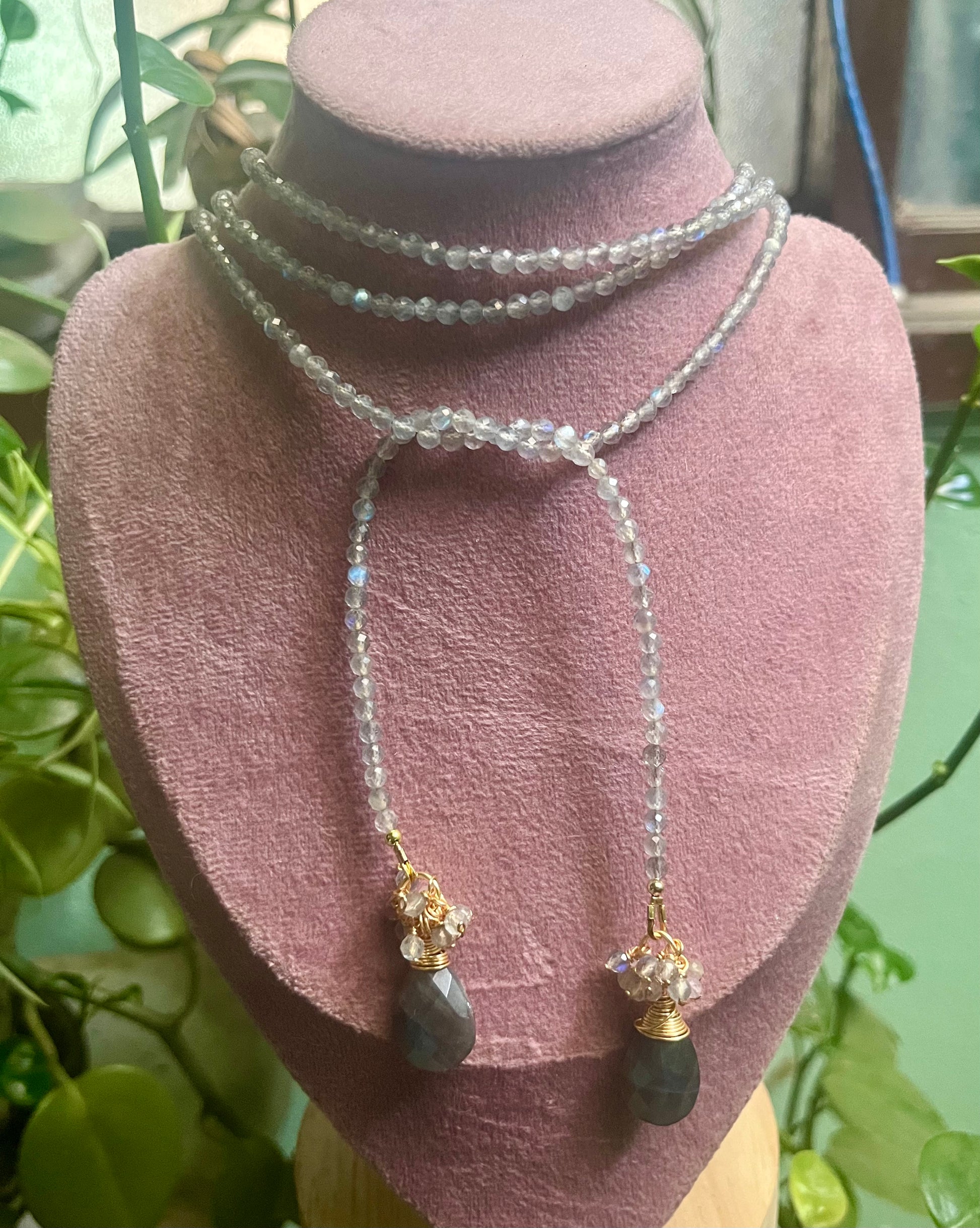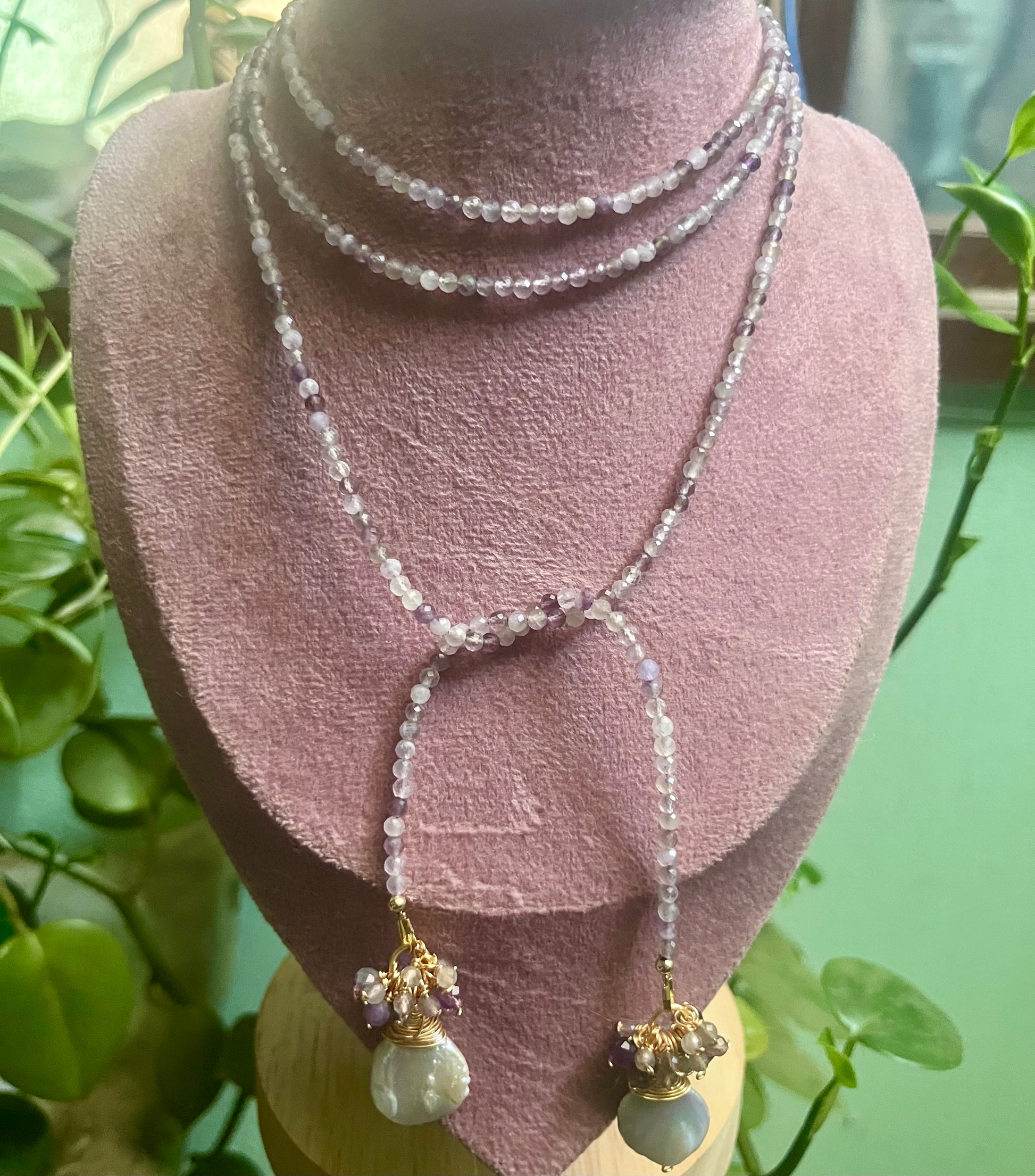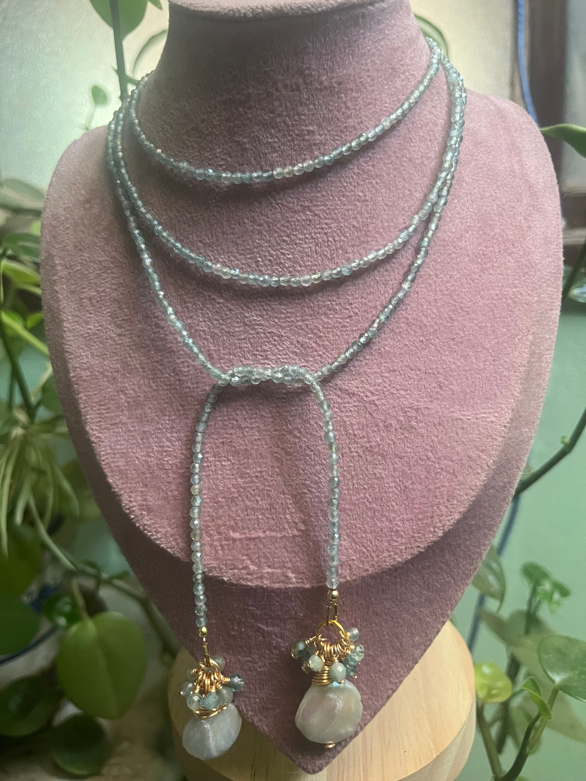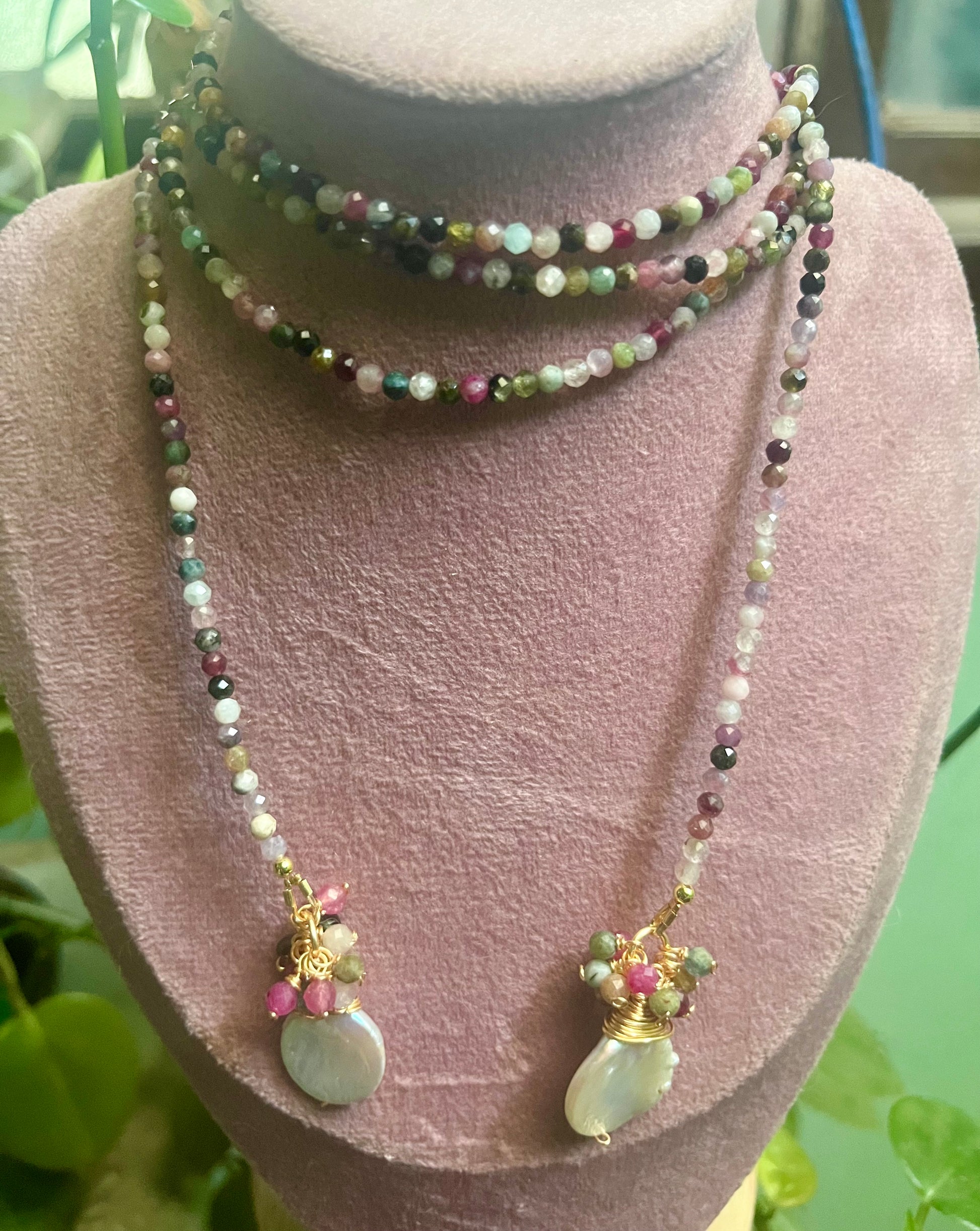 Hecho a mano en chapa de oro, con perlas naturales y cuarzos (turmalina, labradorita, amatista o jade verde).