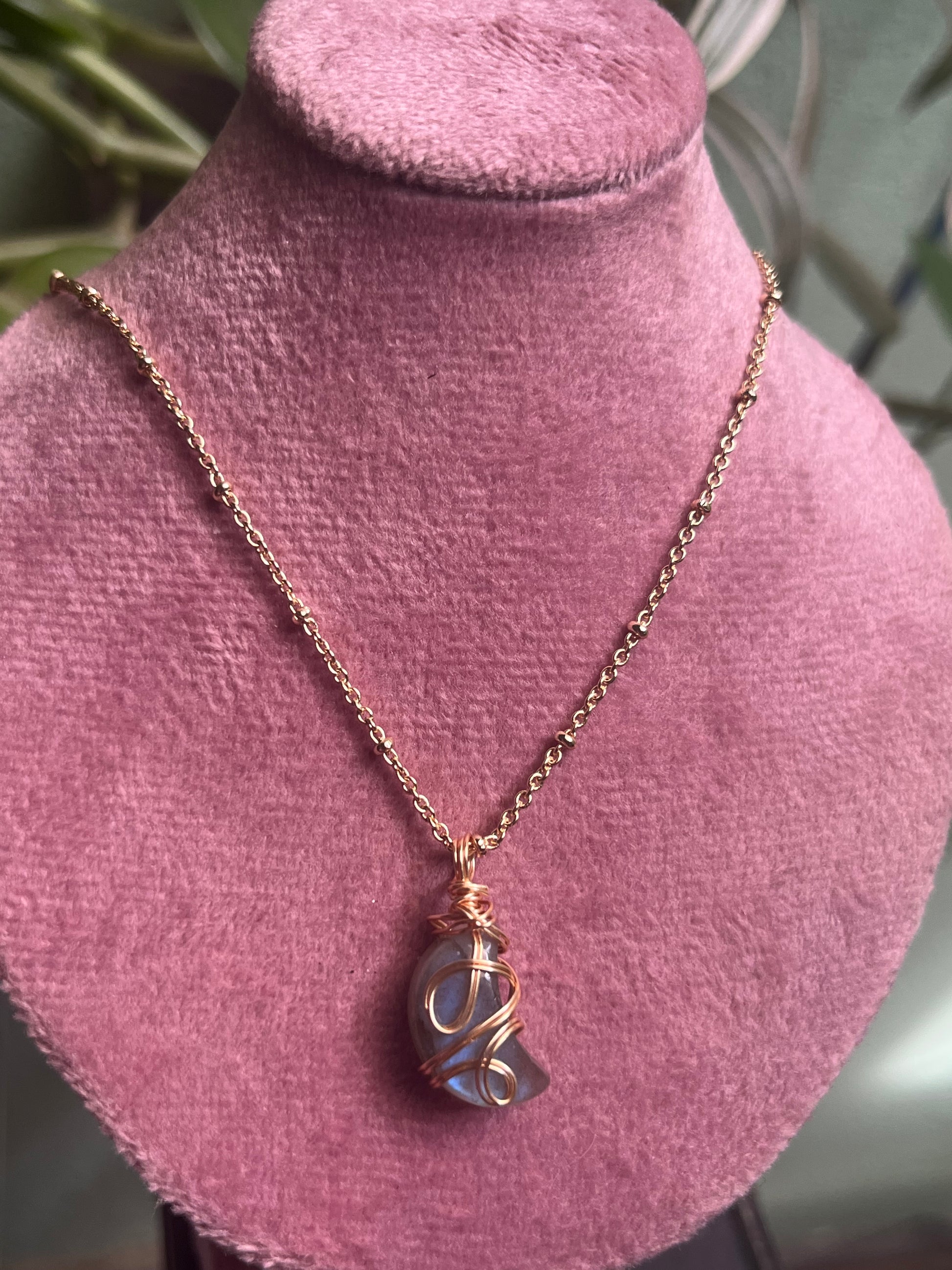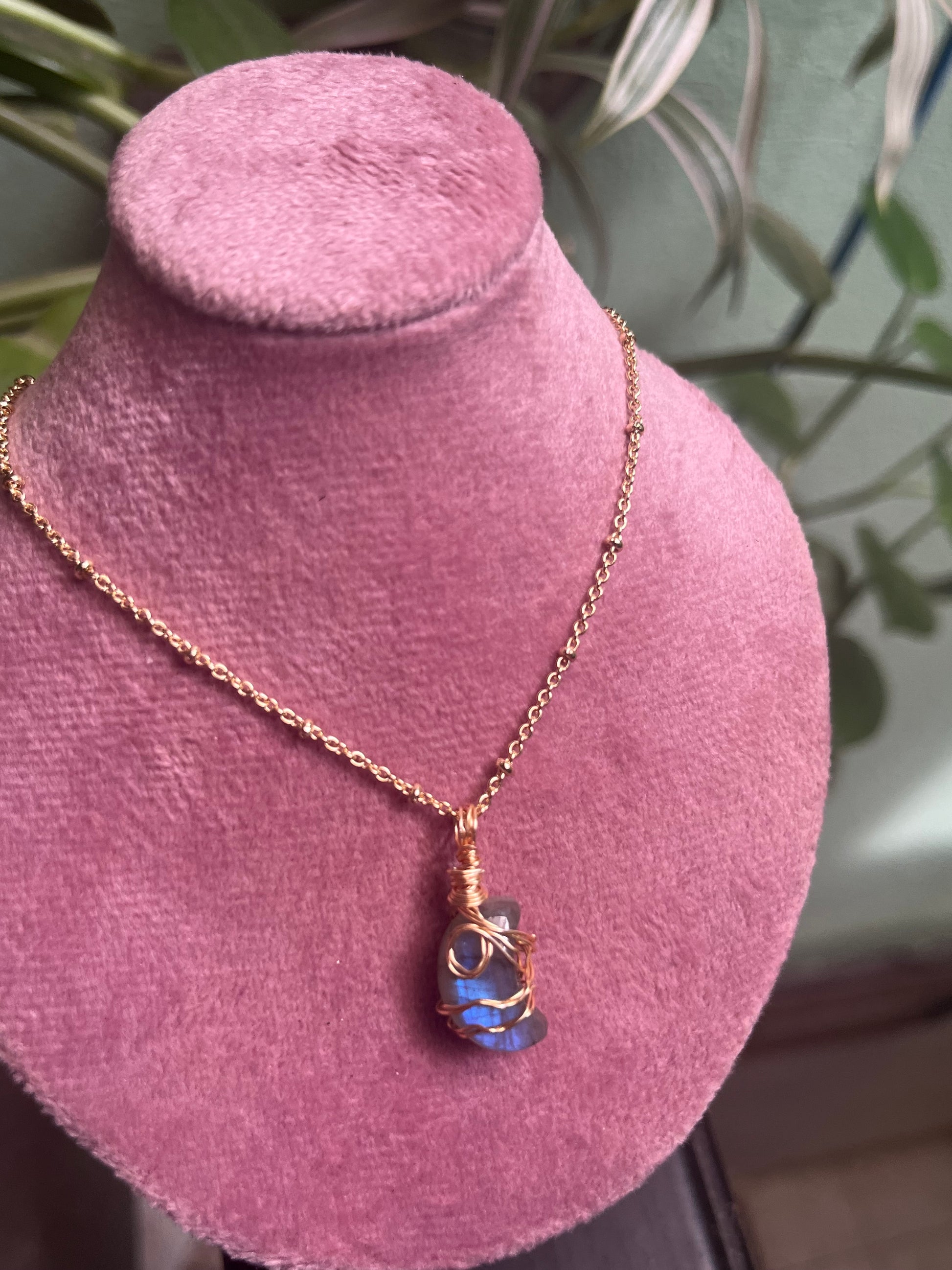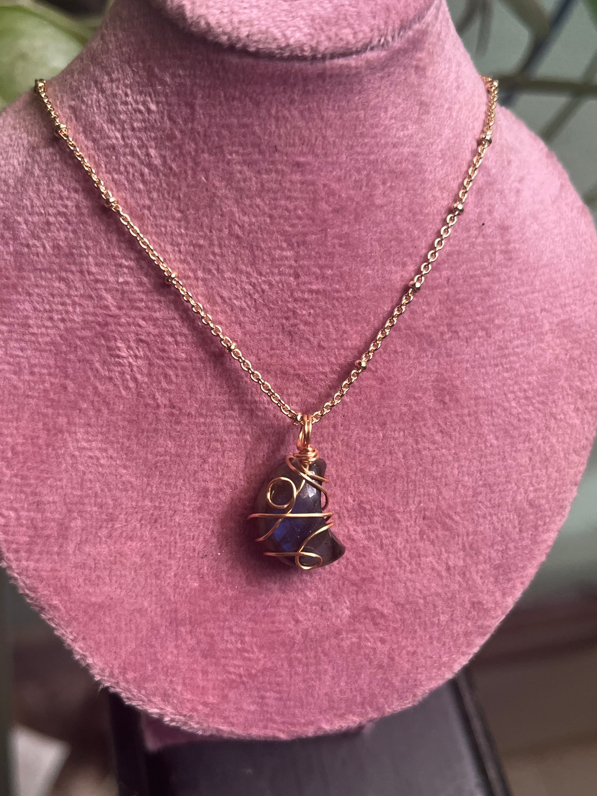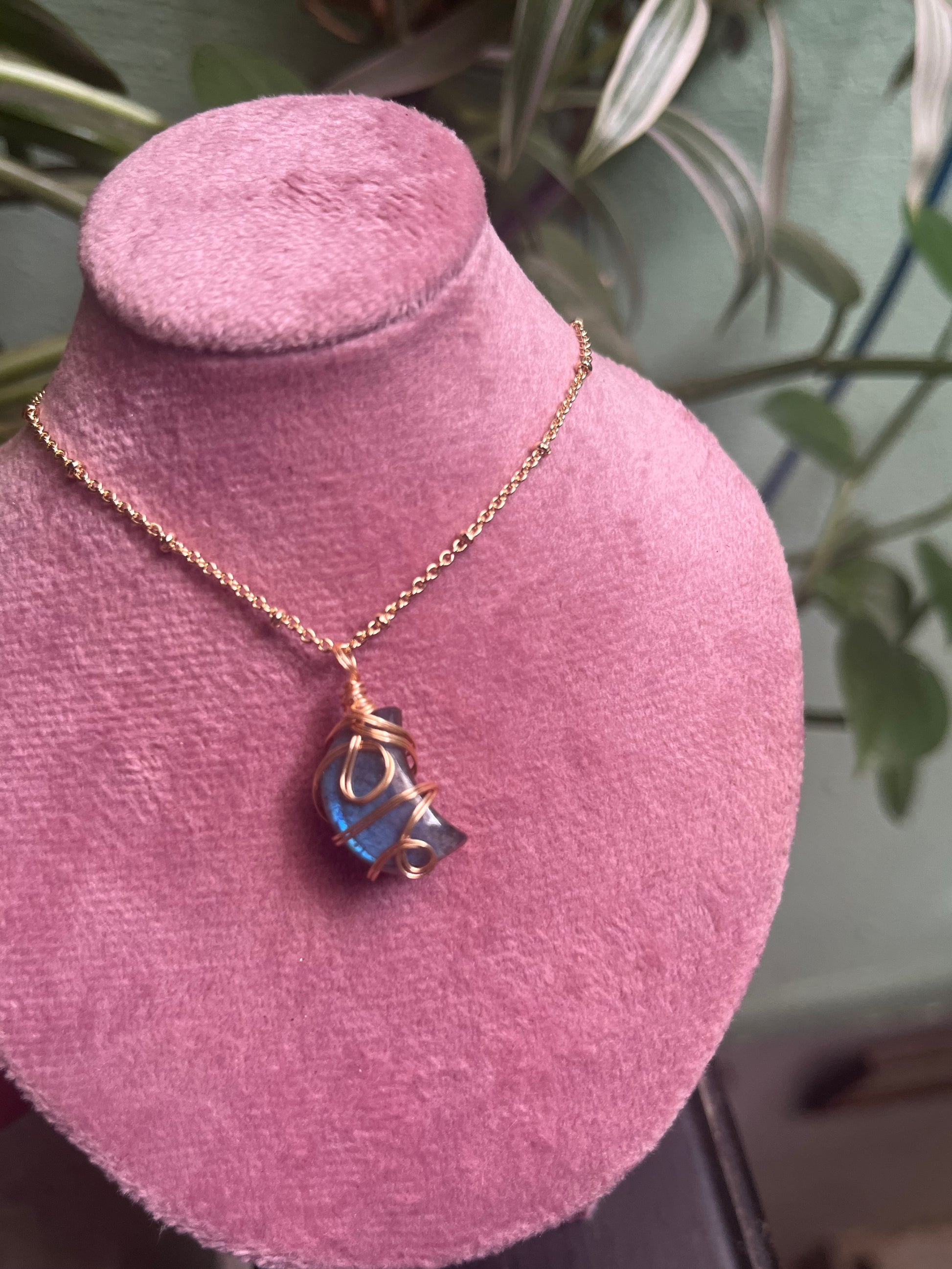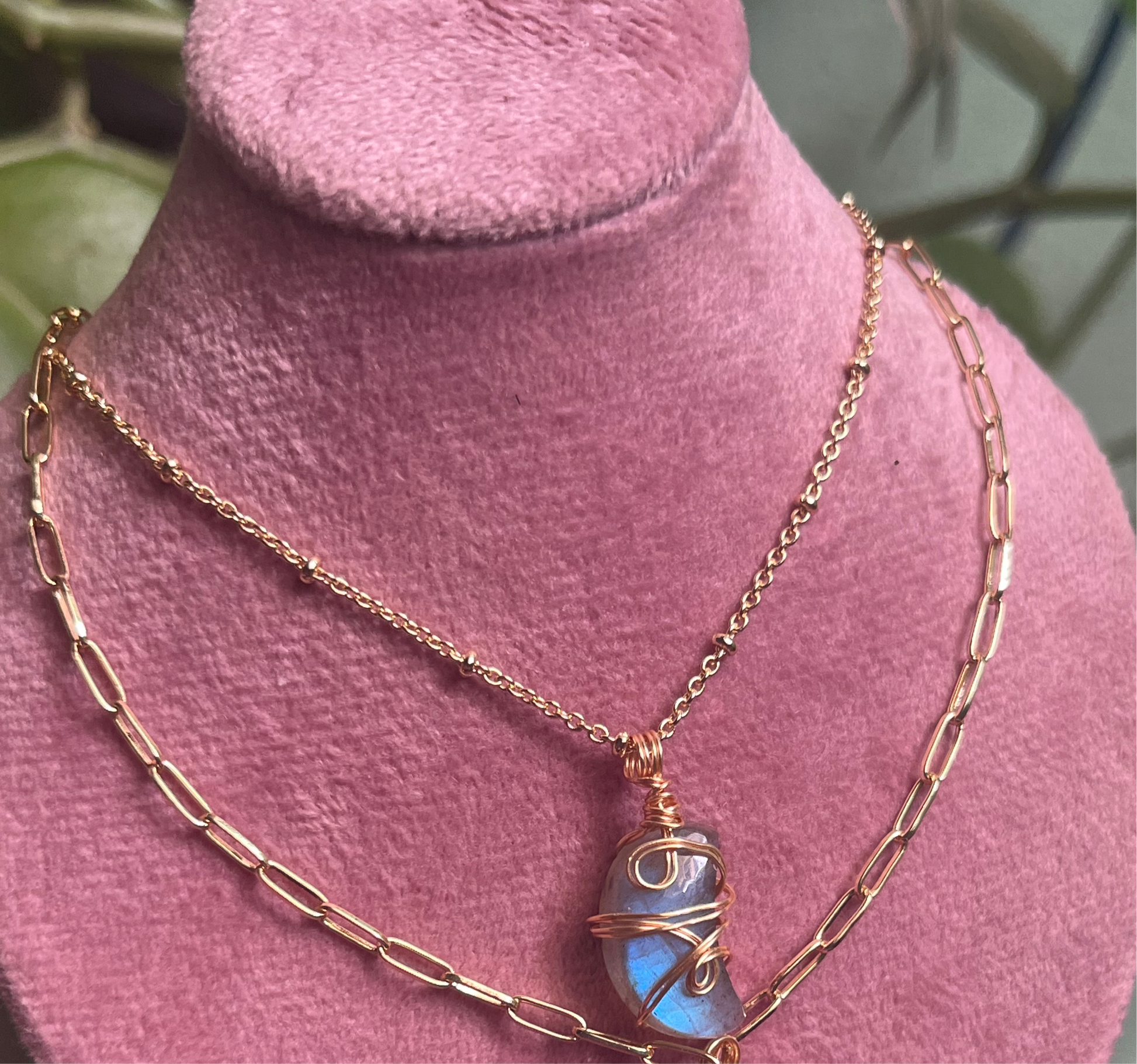 Collar de 50 cm con cadena de chapa de oro de 18 k con colgante de luna de labradorita hecho a mano. La medida de las lunas es de 15x8mm aproximadamente