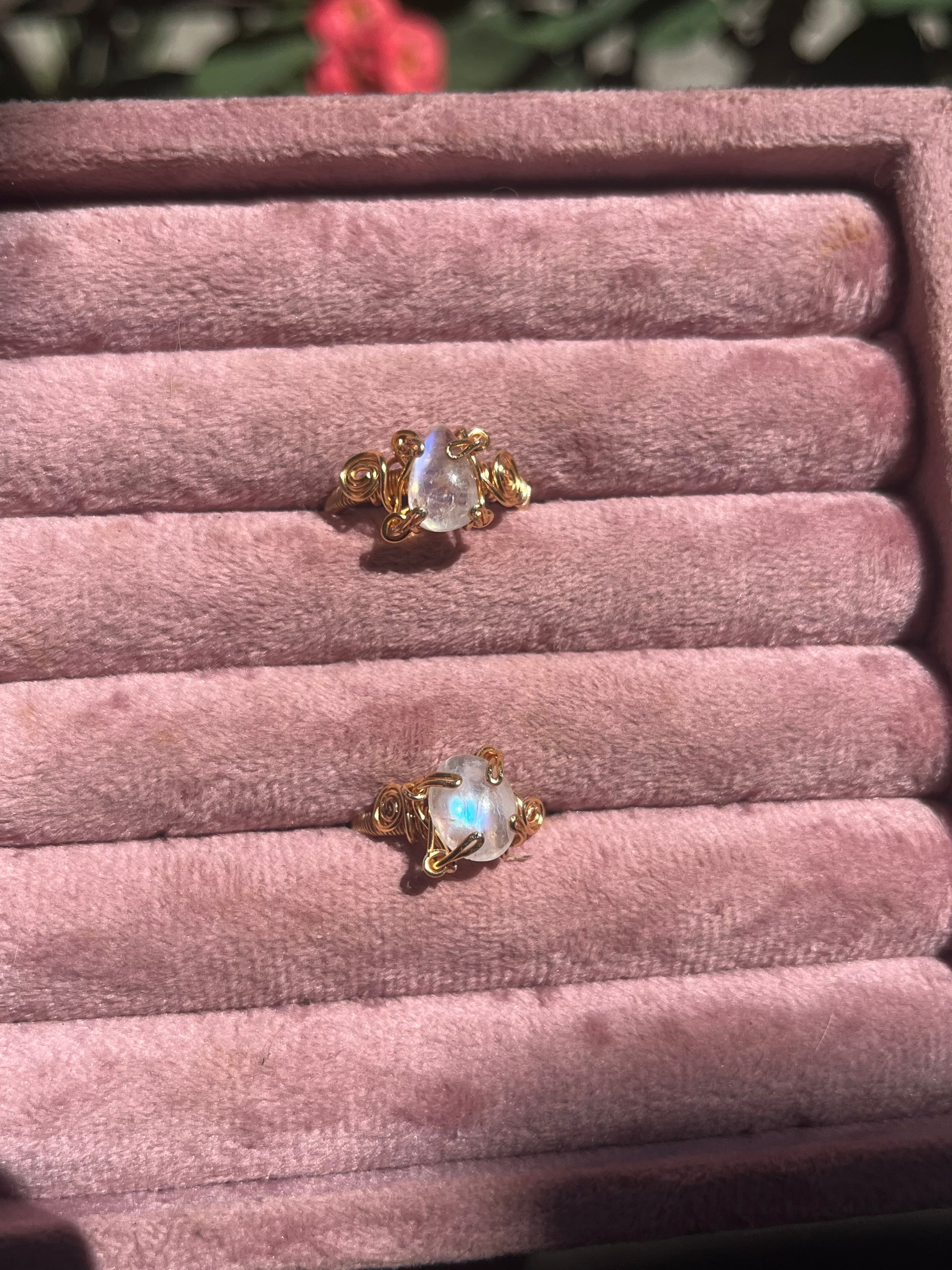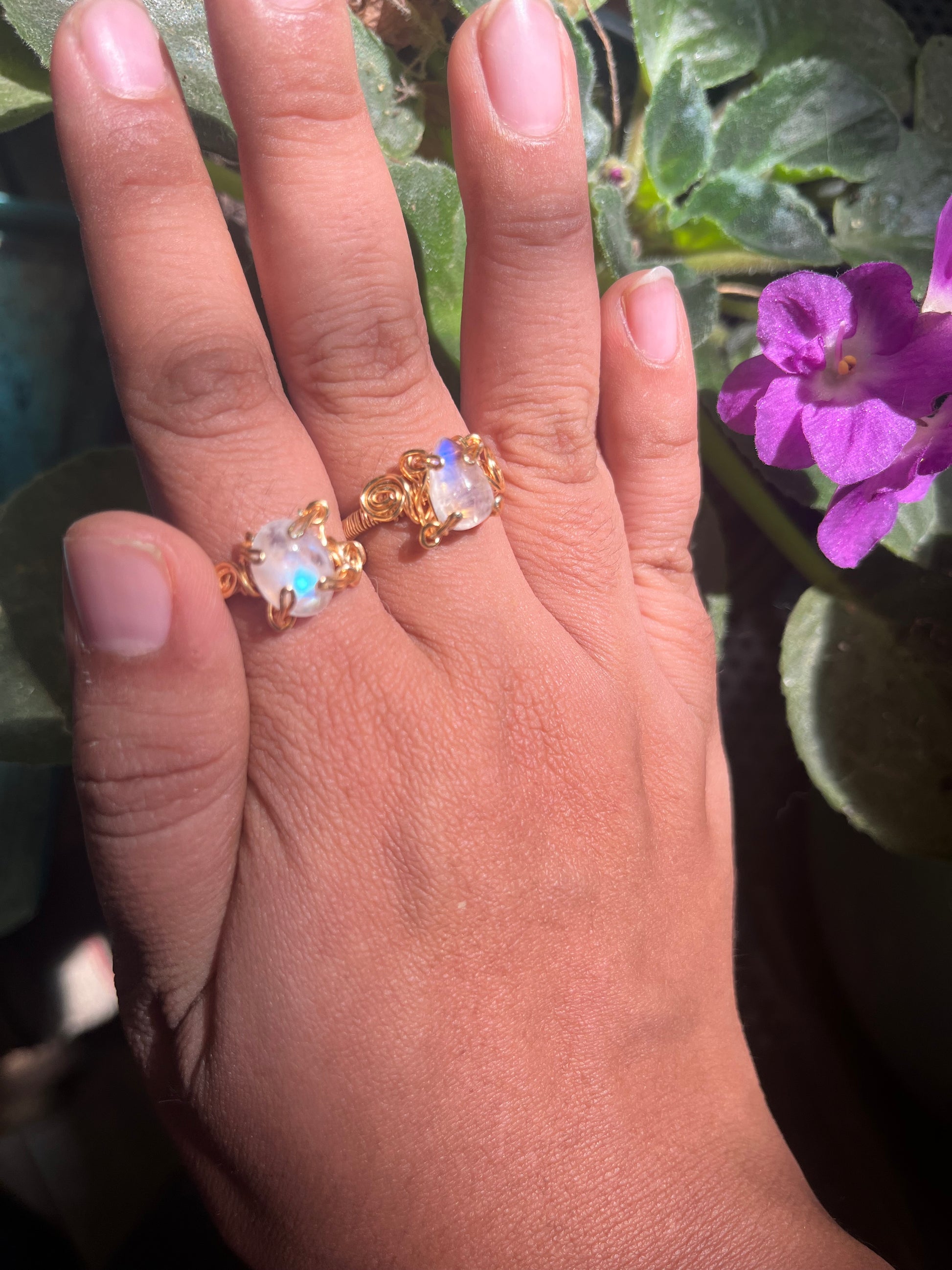Anillo ajustable de piedra luna elaborado con técnica de alambrismo y dije de piedra luna chico. El alambre es chapado en oro de 18k