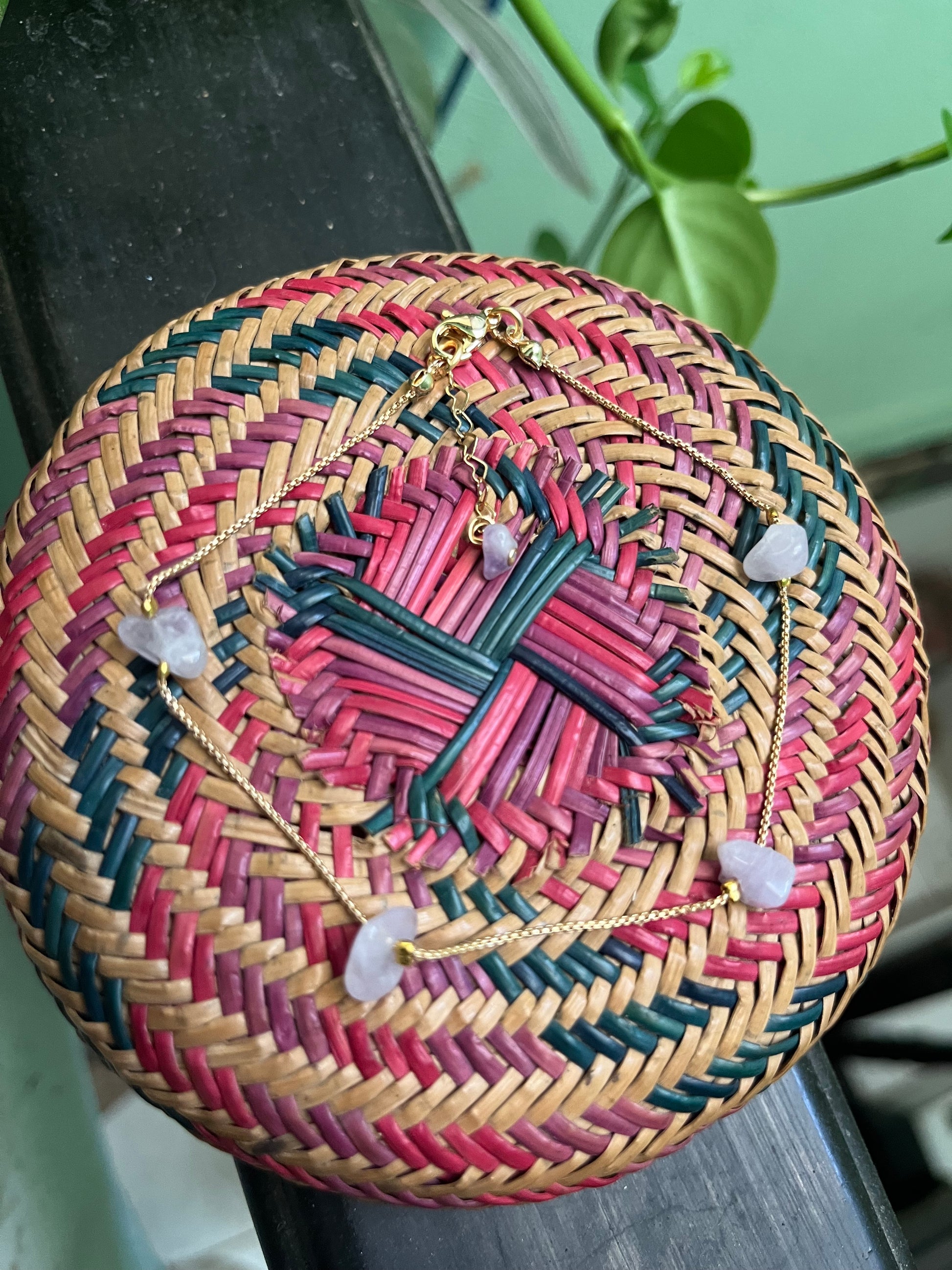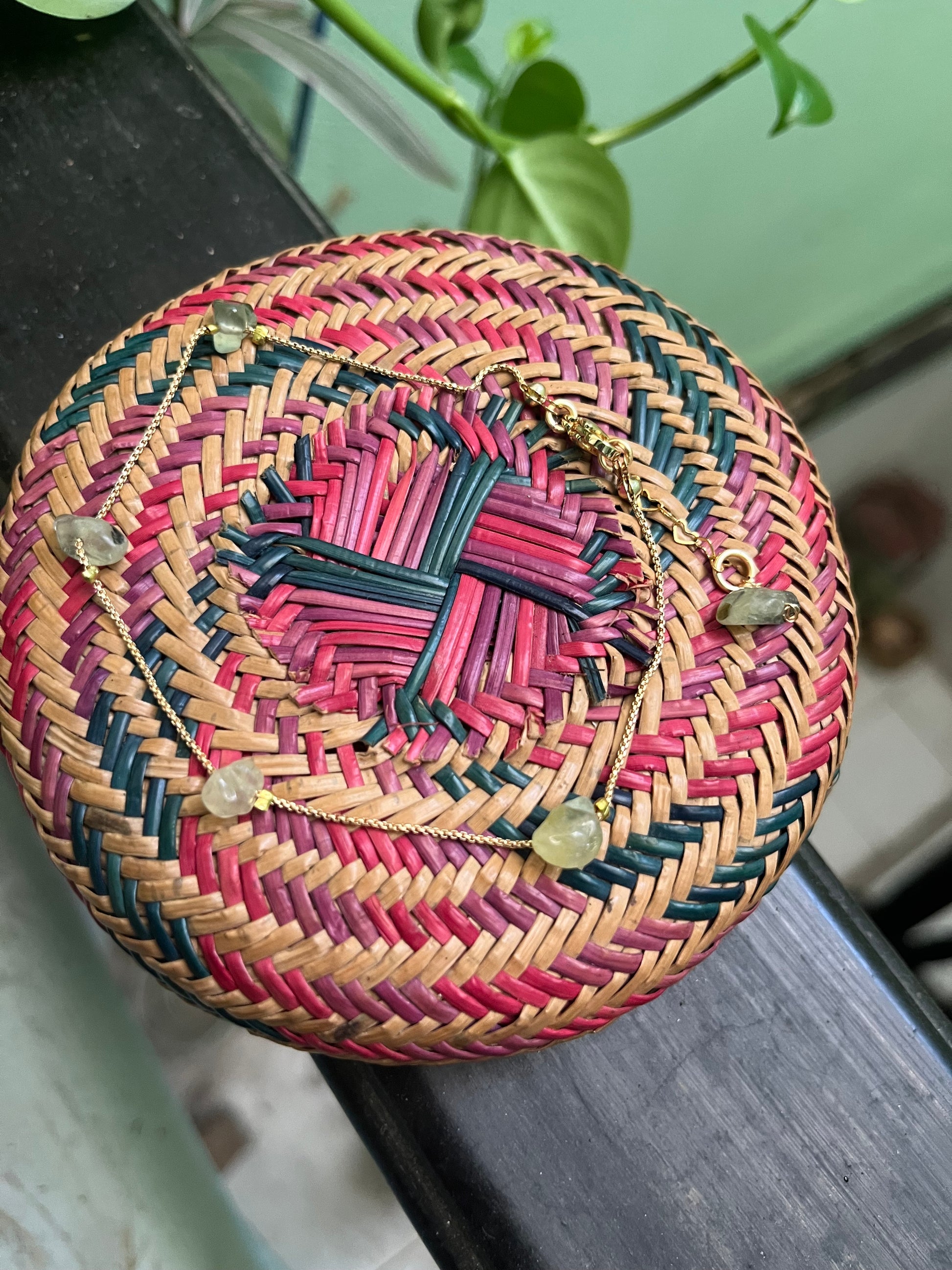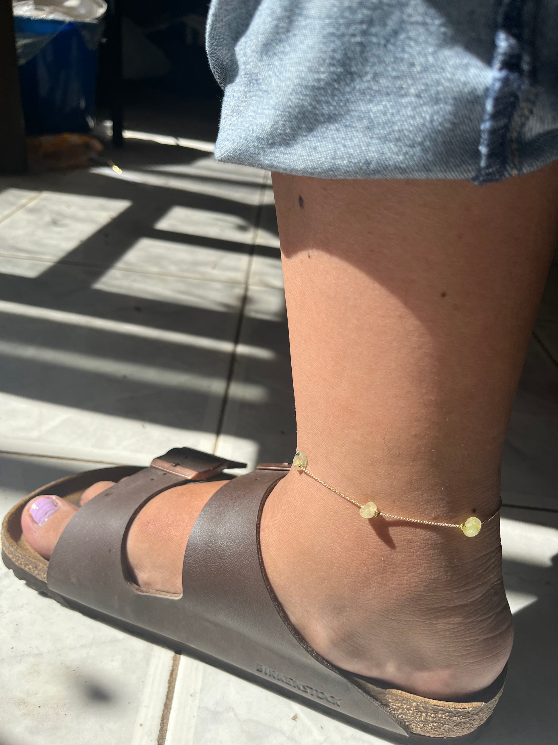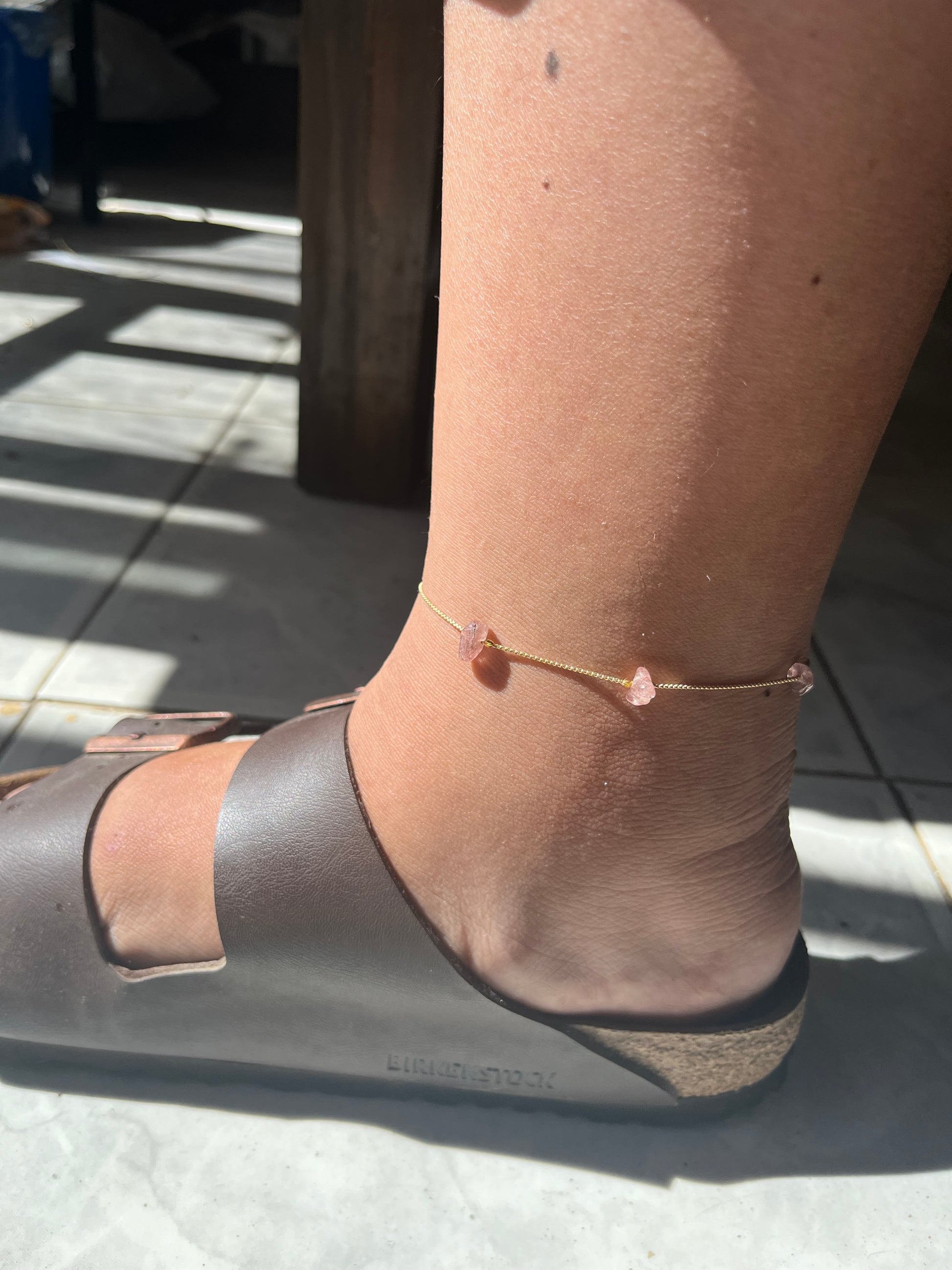 Tobillera de 21 cm con 3 cm de extensor y chips de cuarzo a elegir. Todos los componentes son chapa de oro de 18k.
