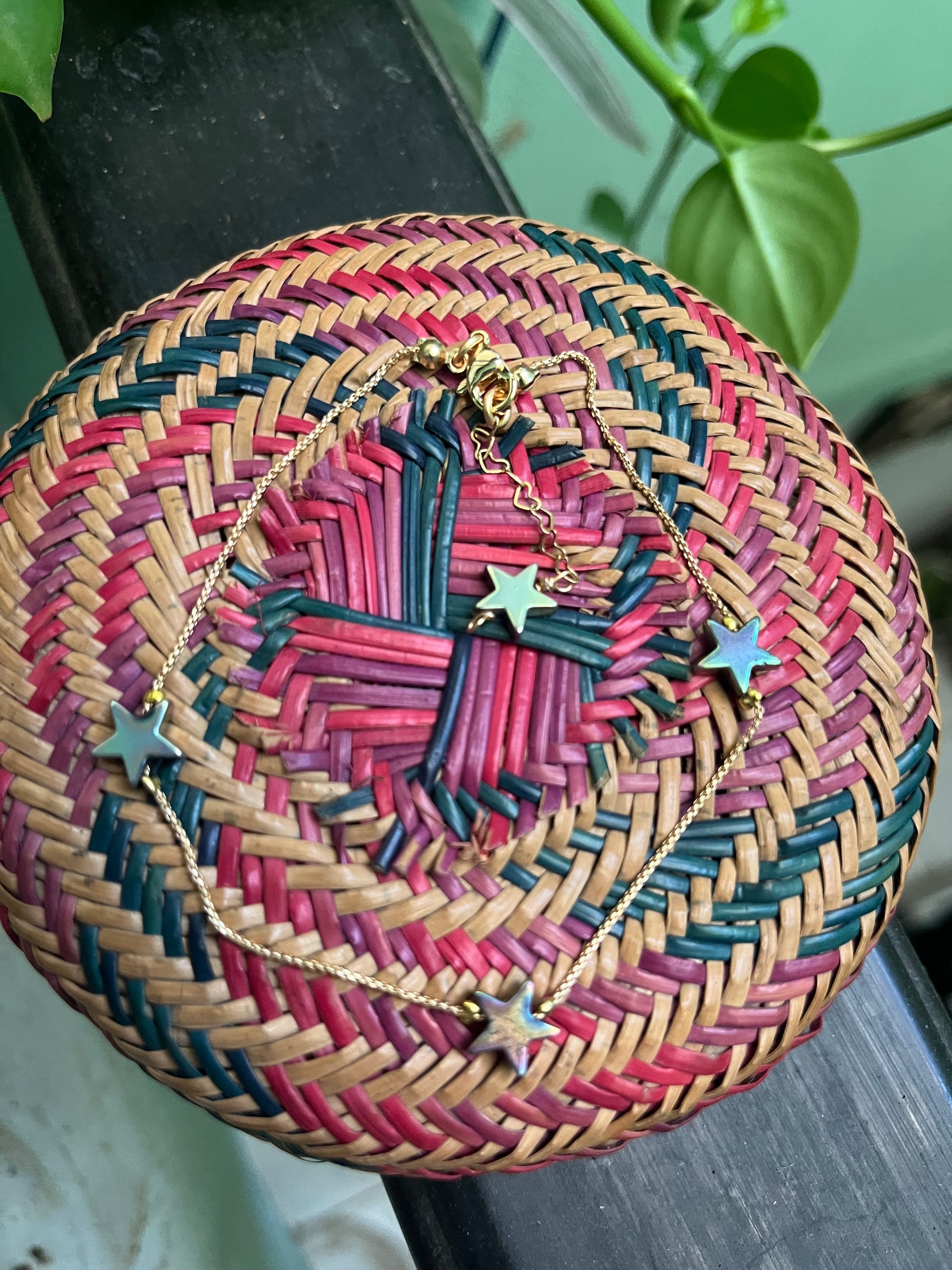 Tobillera de 21 cm con extensor de 3 cm y estrellas de hematita. Todos los componentes son de chapa de oro de 18k.